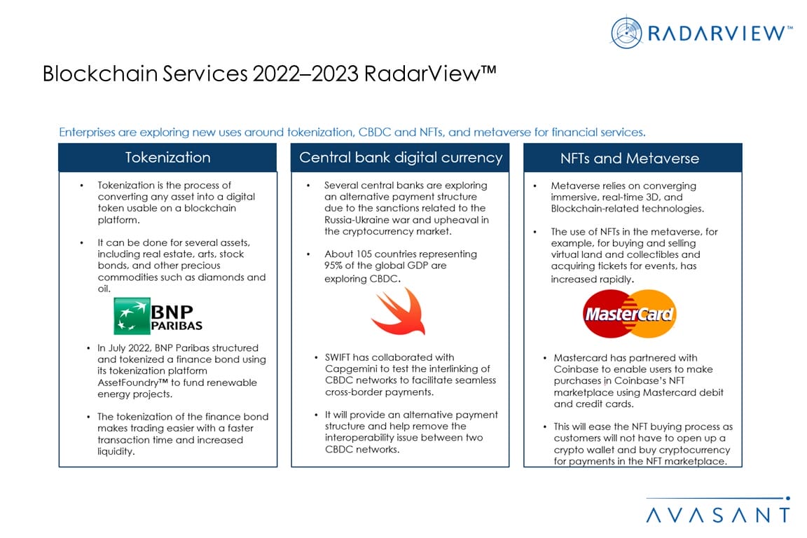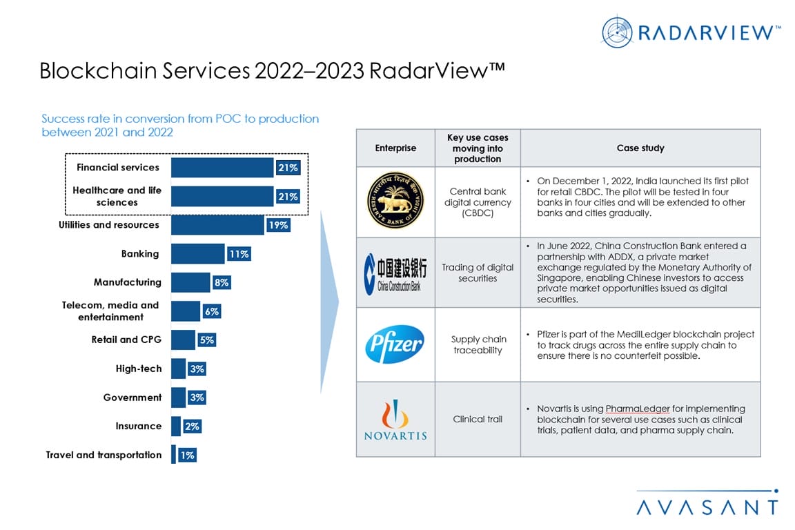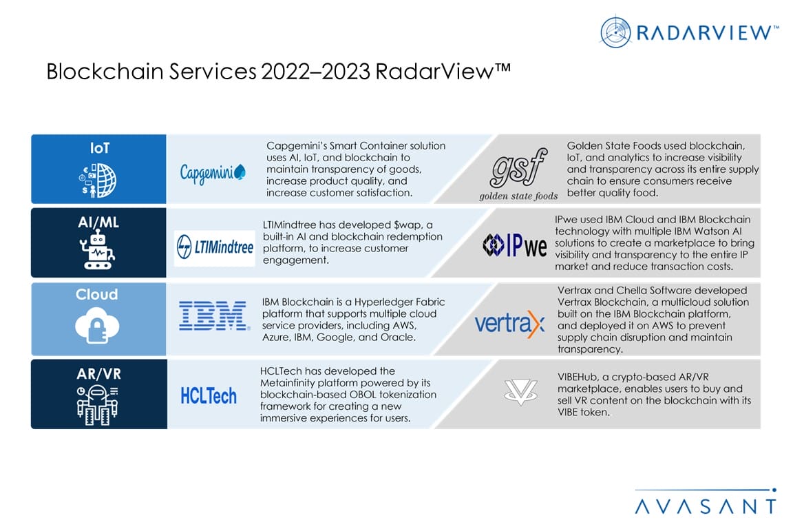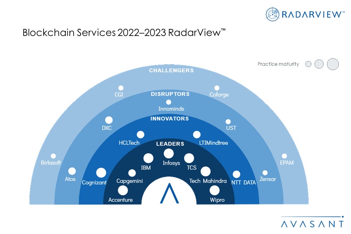 The Blockchain Services 2022–2023 RadarView™ helps companies get a detailed view of the blockchain services landscape, key enterprise and provider trends, and market developments. It also provides information to assist businesses in choosing the right blockchain service provider.