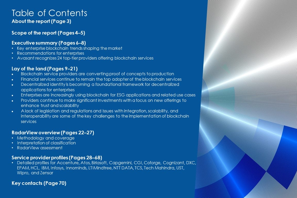 This RadarView includes an analysis of the following service providers in the blockchain services space: Accenture, Atos, Birlasoft, Capgemini, CGI, Coforge, Cognizant, DXC, EPAM, HCL, IBM, Infosys, Innominds, LTIMindtree, NTT DATA, TCS, Tech Mahindra, UST, Wipro, and Zensar.