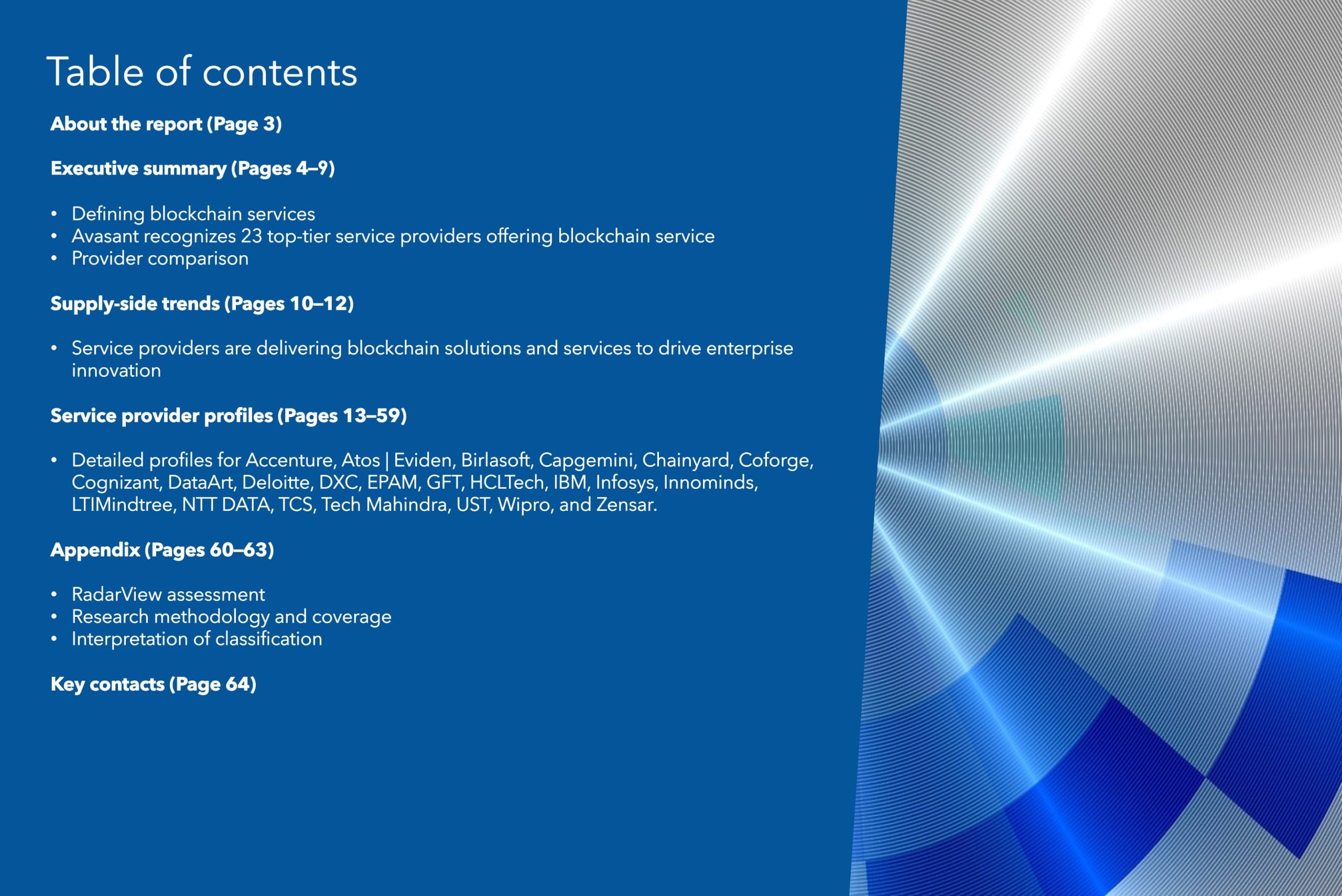 This RadarView includes a detailed analysis of the following service providers in the blockchain services space: Accenture, Atos | Eviden, Birlasoft, Capgemini, Chainyard, Coforge, Cognizant, DataArt, Deloitte, DXC, EPAM, GFT, HCLTech, IBM, Infosys, Innominds, LTIMindtree, NTT DATA, TCS, Tech Mahindra, UST, Wipro, and Zensar.