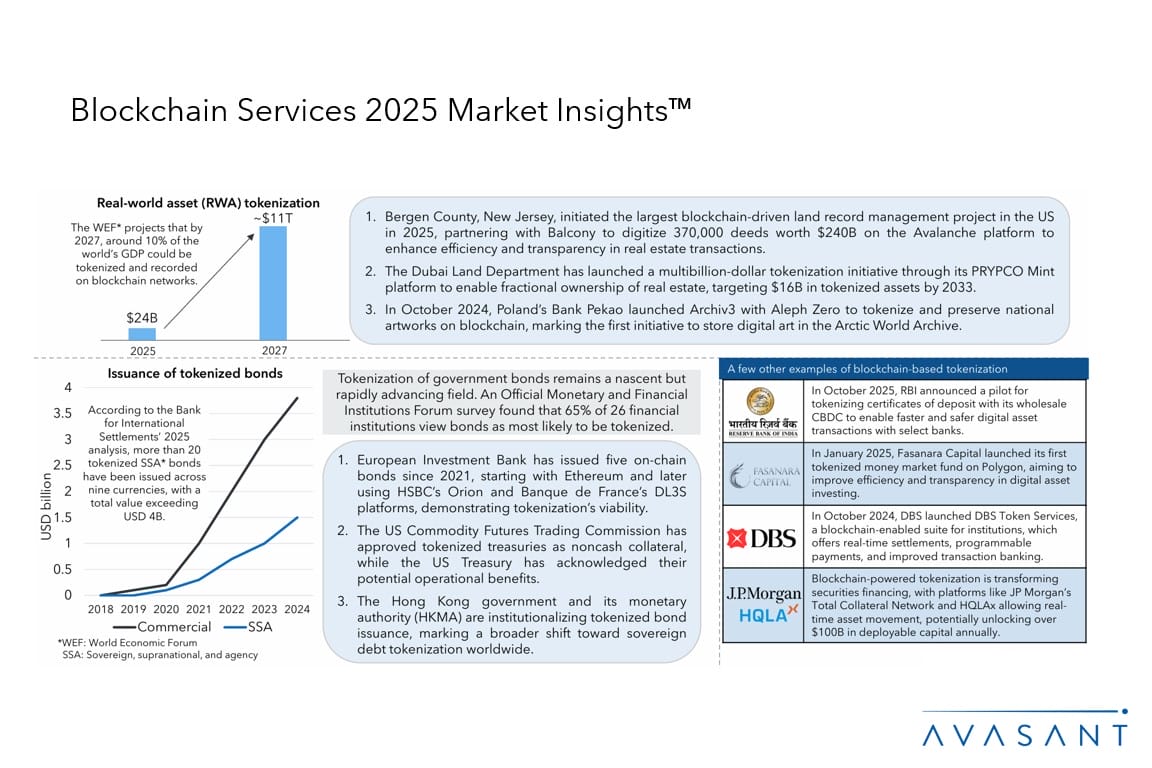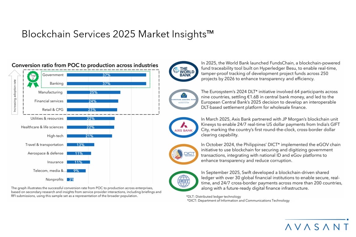 Enterprises are advancing blockchain adoption from pilots to large-scale production, driving operational efficiency, trust, and transparency. The banking, government, and manufacturing sectors continue to lead in enterprise implementation. Blockchain’s convergence with AI is enhancing data integrity, automation, and real-time decision-making. Service providers are enabling interoperability across platforms and developing blockchain-based digital identity solutions to strengthen security. The rise of tokenized assets and central bank digital currencies (CBDCs) is further redefining digital value exchange, while partnerships and platform maturity are accelerating blockchain’s role in enterprise transformation and decentralized innovation.