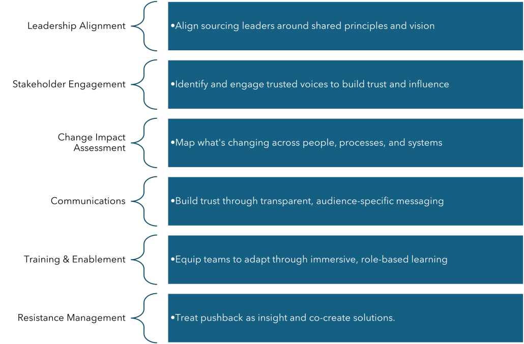Avasant uses a Resistance Risk Heatmap to identify emotional friction early. In one healthcare merger, procurement staff who initially resisted centralization were invited to co-design the new sourcing workflow. Their input made the end result more robust—and ensured that critical institutional practices weren’t lost.