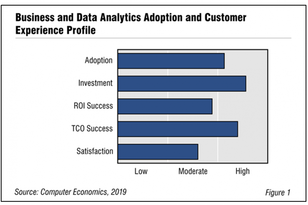 As shown in Figure 1 from our full report, Business and Data Analytics Adoption Trends and Customer Experience, the adoption rate, investment rate, and TCO success rate for business and data analytics are all high, compared with other technologies in our Technology Trends study.