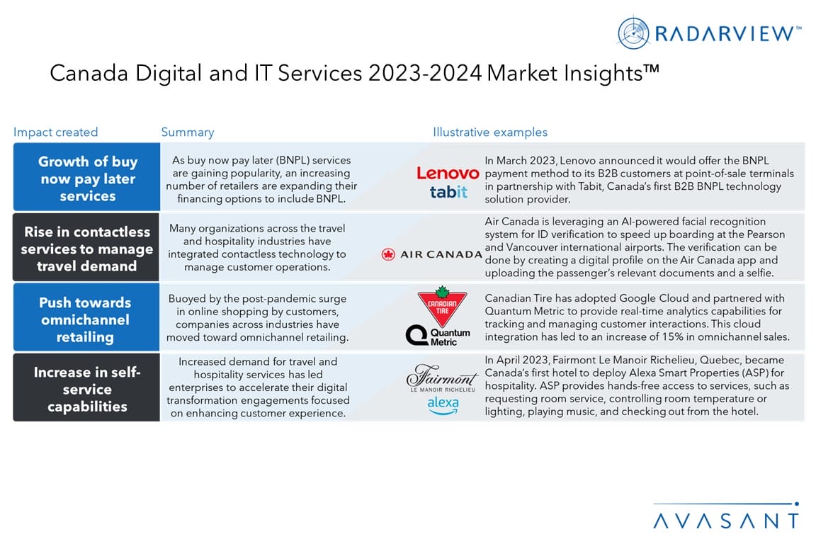 Please refer to Avasant’s Canada Digital and IT Services 2023–2024 RadarView™ for detailed insights on the service providers and supply-side trends.