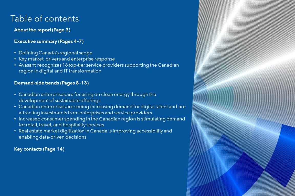 This report identifies key demand-side trends in the Canadian region that can help enterprises fine-tune their digital and IT strategies. It also provides an overview of enterprise challenges in this space based on Avasant’s assessment.
