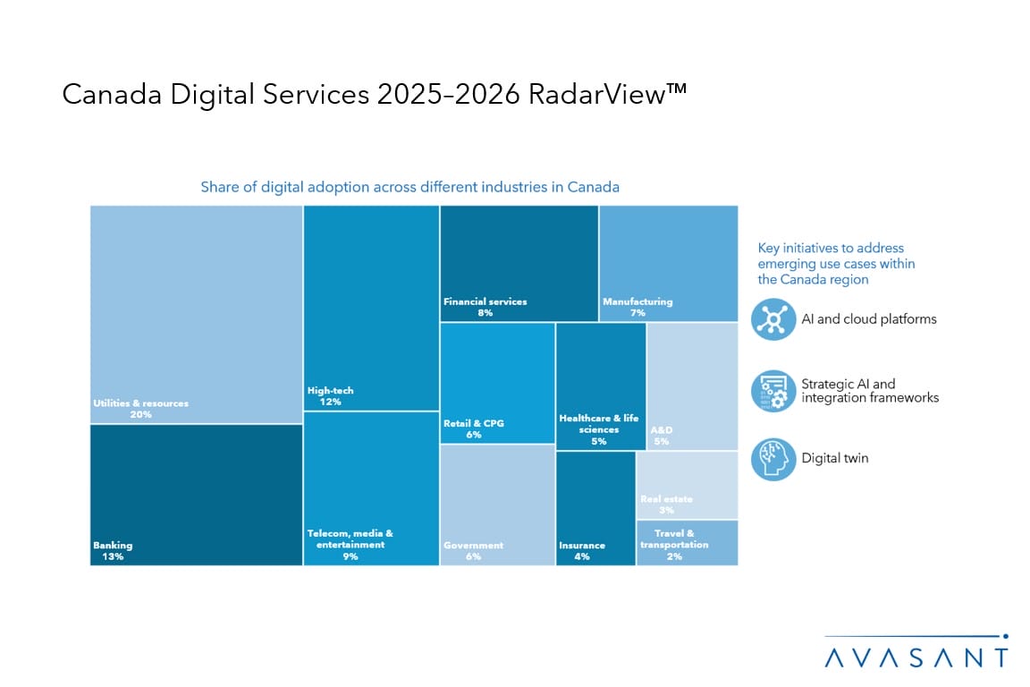 The Canada Digital Services 2025–2026 RadarView™ highlights key supply-side trends in Canada and Avasant’s viewpoint on them. It helps Canada-based companies identify top service providers to support their digital transformation initiatives. It also analyzes each service provider’s capabilities in technology and delivery support, enabling organizations to identify the right strategic partners.