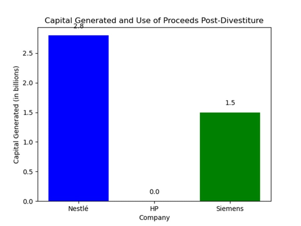 Figure 1 illustrates the immediate capital generated by three major corporations, Nestlé, HP, and Siemens, through different types of divestitures, along with how these proceeds were used. Nestlé generated $2.8 billion through the sale of its U.S. confectionery business to Ferrero. These funds were reinvested into high-growth sectors such as health and wellness, aligning with evolving consumer trends. HP underwent a strategic company split into HP Inc. and Hewlett-Packard Enterprise. While no direct cash inflow occurred, the internal restructuring enabled increased specialization, agility, and operational focus. Siemens spun off its lighting division, Osram, resulting in a market revaluation that unlocked an estimated $1.5 billion in capital. This was redirected toward Siemens’ core industrial automation and digital infrastructure businesses. Figure 1 emphasizes how a divestiture can be a value-creating strategy not just for immediate cash generation but for repositioning and strengthening long-term business capabilities.