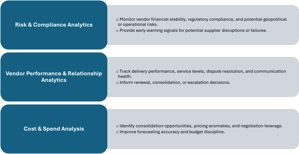To drive smarter decision-making in today’s complex vendor ecosystems, executives should focus on three high-impact analytics areas that enhance visibility, mitigate risk, and optimize value. (see Figure 1)