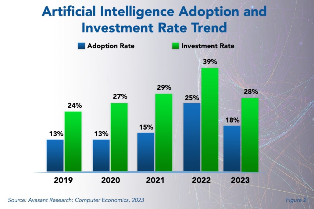 Nevertheless, at the time of this survey, AI was still not finding quite as much traction as one would expect. As shown in Figure 2 from our full report, AI Adoption Trends and Customer Experience, the adoption rate for AI is 18% of all organizations in 2023, down from 25% in 2022. During the same period, the percentage of organizations making new investments in AI dropped from 39% in 2022 to 28% in 2023.