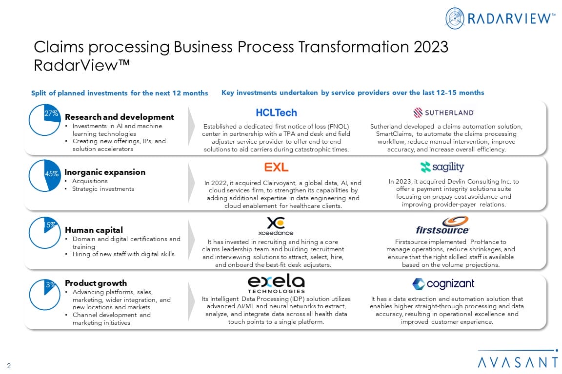 The Claims Processing Business Process Transformation 2023 RadarView™ highlights key supply-side trends in the claims processing transformation services space and Avasant’s viewpoint. It aids companies in identifying top service providers to assist them with claims processing outsourcing services. It also analyzes each service provider’s technology and delivery support capabilities, enabling organizations to identify the right strategic partners for claims processing services.