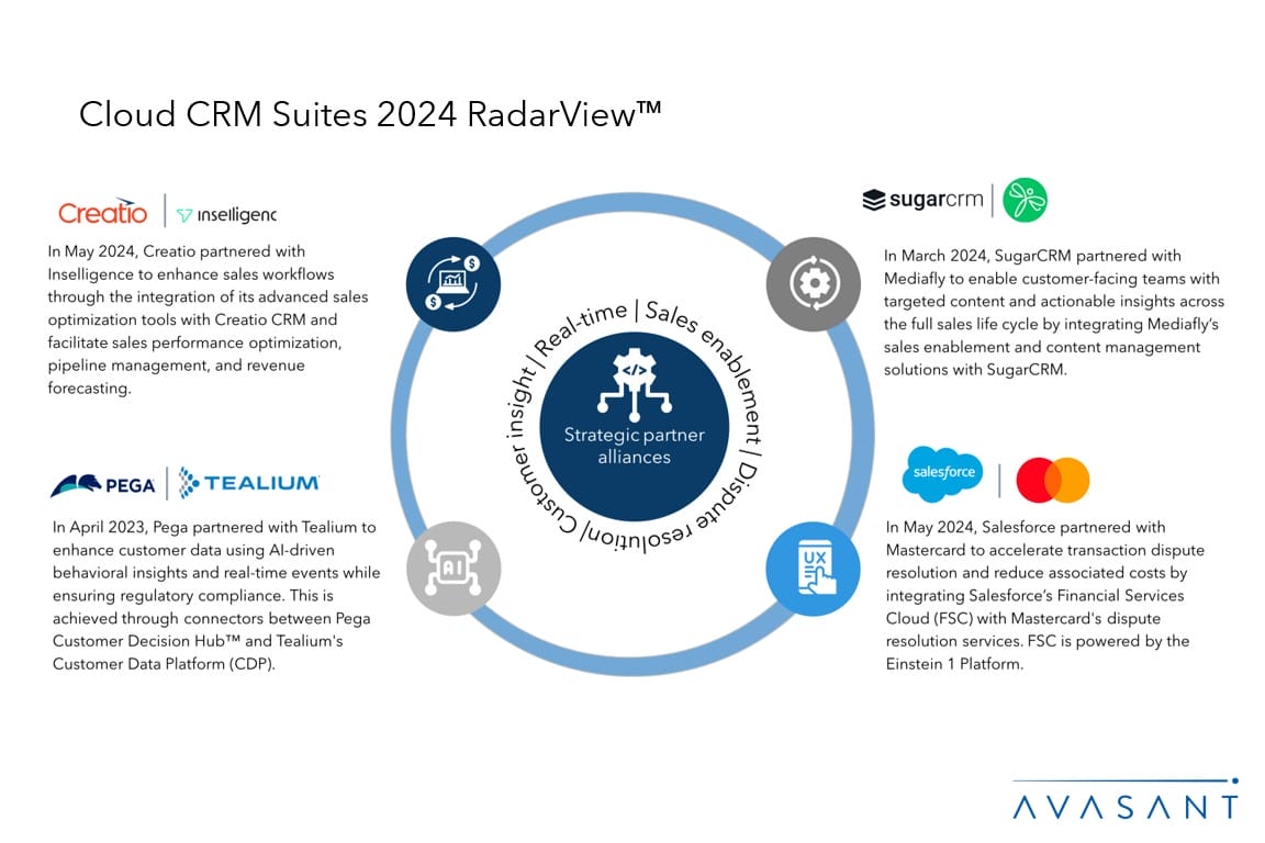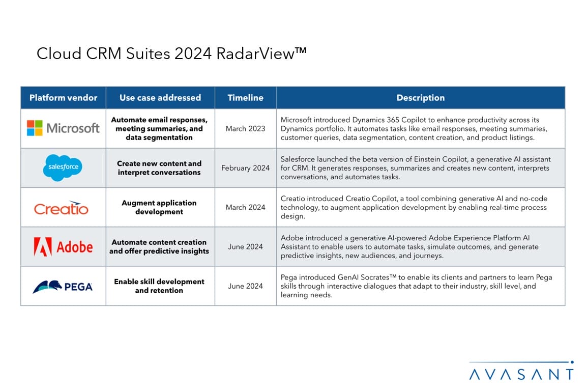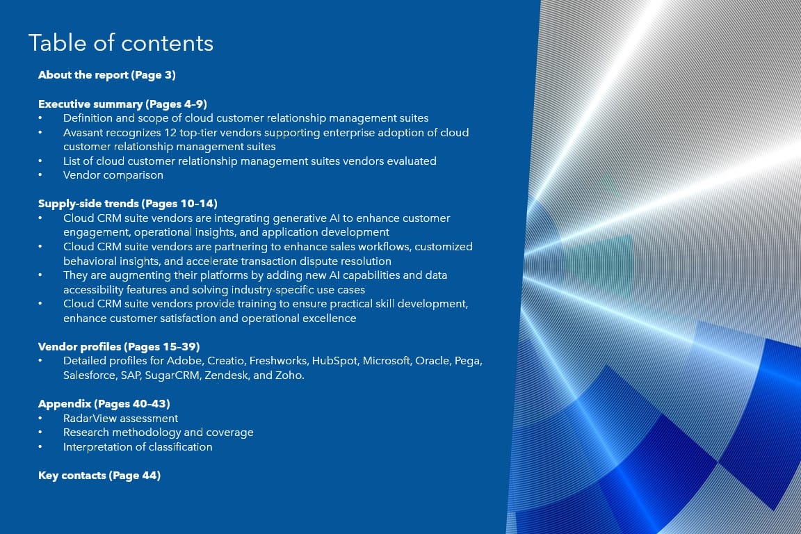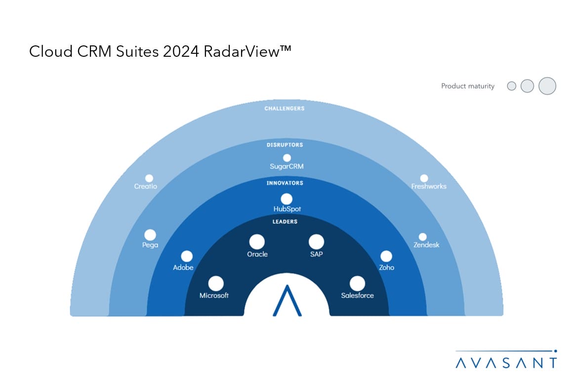 The Cloud Customer Relationship Management Suites 2024 RadarView™ highlights key supply-side trends in the CRM platforms space and Avasant’s viewpoint. It aids companies in identifying top vendors to assist them in their CRM adoption journeys. It also analyzes each vendor’s capabilities in technology and delivery support, enabling organizations to identify the right strategic partners for CRM adoption.