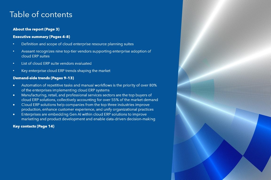 This report identifies key demand-side trends in the cloud ERP suites market, helping enterprises fine-tune their ERP adoption strategies. It includes key trends and enterprise business challenges in the ERP suites space based on Avasant’s assessment.