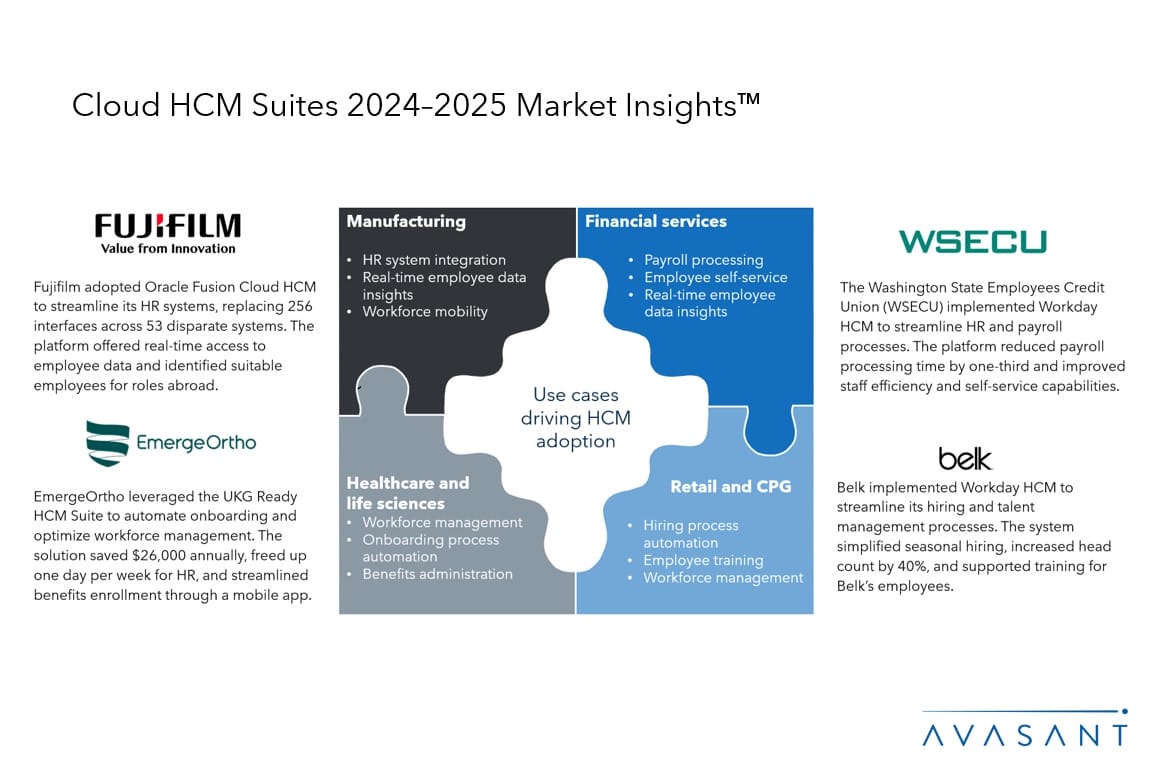 Enterprises are adopting cloud HCM suites to streamline and automate HR processes while centralizing HR management. This allows them to save time on payroll processing, enhance compliance across multiple regions, simplify workforce management, and derive actionable insights from unified platforms. Enterprises in the manufacturing and retail industries are the leading adopters of cloud HCM solutions. Manufacturers focus on use cases such as workforce optimization with shift scheduling, skills tracking, and labor forecasting, while retail companies leverage HCM solutions for time and attendance tracking, performance management, and handling seasonal workforce fluctuations. Organizations are also leveraging generative AI to automate routine inquiries, provide personalized employee support, deliver tailored learning recommendations, and generate insights from workforce data for strategic decision-making.