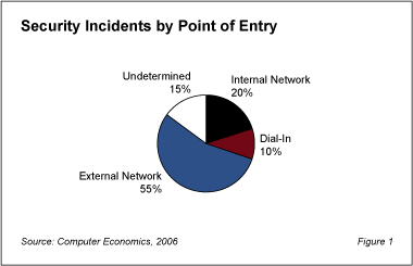 Computer Economics research reveals that security risks from insiders continue to pose a threat. According to our recently released 2006 IT Security Study, a high percentage of security breaches are directly attributable to employees, contractors, and other insiders that have access within the firewall. Figure 1 illustrates that, at a minimum, 20% of all security breaches happen inside the firewall, and the total may be as high as 35%. While it is not being suggested that technical personnel are responsible for a significant number of those breaches, their special access rights do make it important to pay attention to the procedures that they follow on a daily basis. It is also important to recognize that these same individuals usually have access to the systems that are designed to detect malicious activity, which would allow them to delete log files, for example.