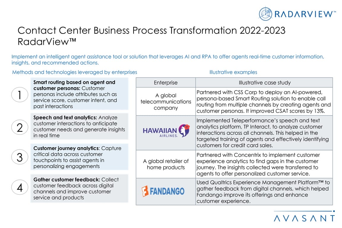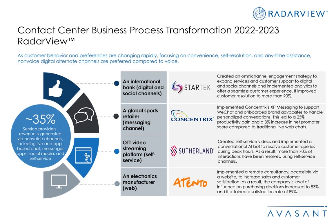 The Contact Center Business Process Transformation 2022–2023 RadarView aids companies in identifying top service providers to reinvent their customer service. It also offers an analysis of each service provider’s capabilities in technology and delivery support, thus enabling organizations to identify the right strategic partners for their contact center transformation.