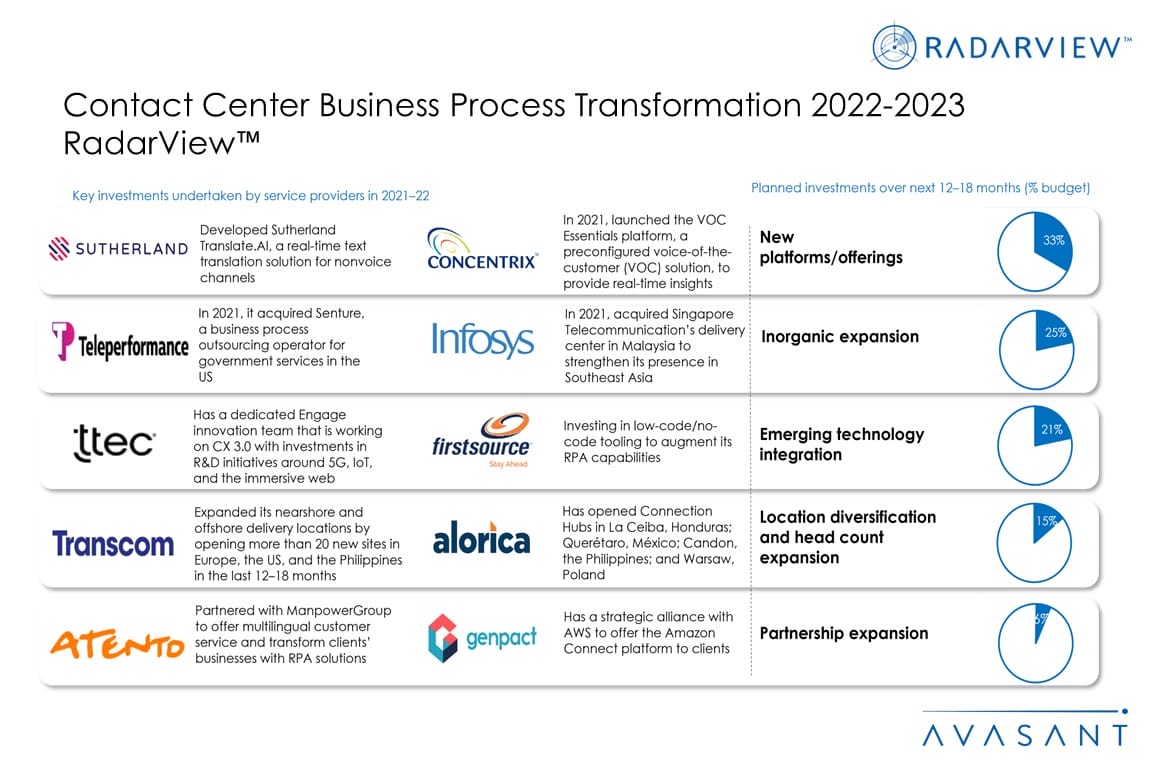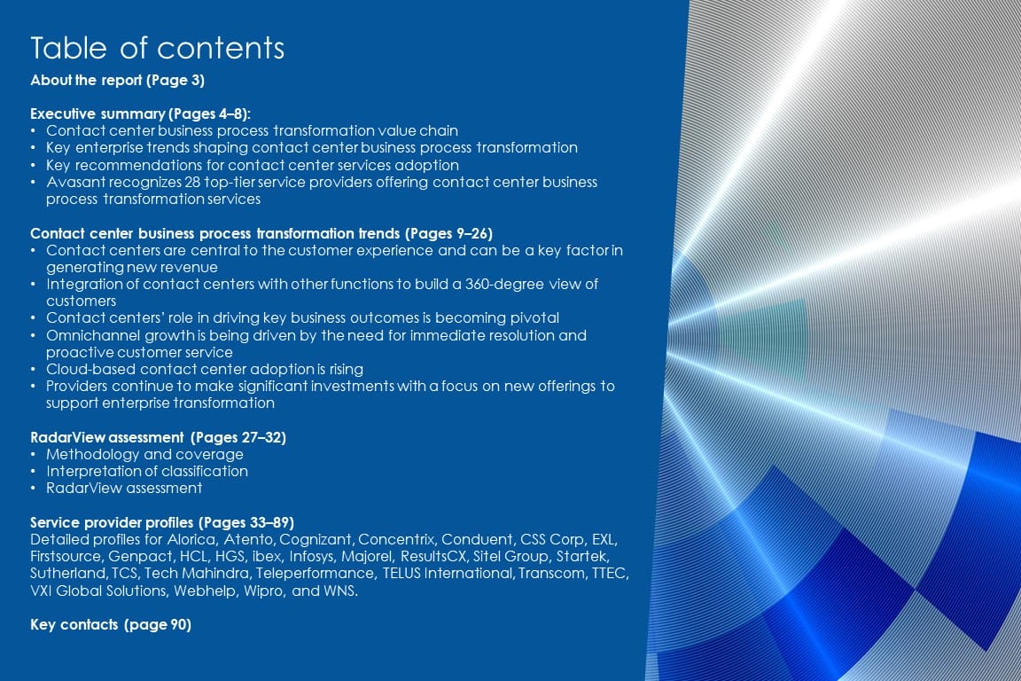 This RadarView includes an analysis of the following service providers in the contact center business process transformation space: Alorica, Atento, Cognizant, Concentrix, Conduent, CSS Corp, EXL, Firstsource, Genpact, HCL, HGS, ibex, Infosys, Majorel, ResultsCX, Sitel Group, Startek, Sutherland, Tech Mahindra, TCS, Teleperformance, TELUS International, Transcom, TTEC, VXI Global Solutions, Webhelp, Wipro, and WNS.