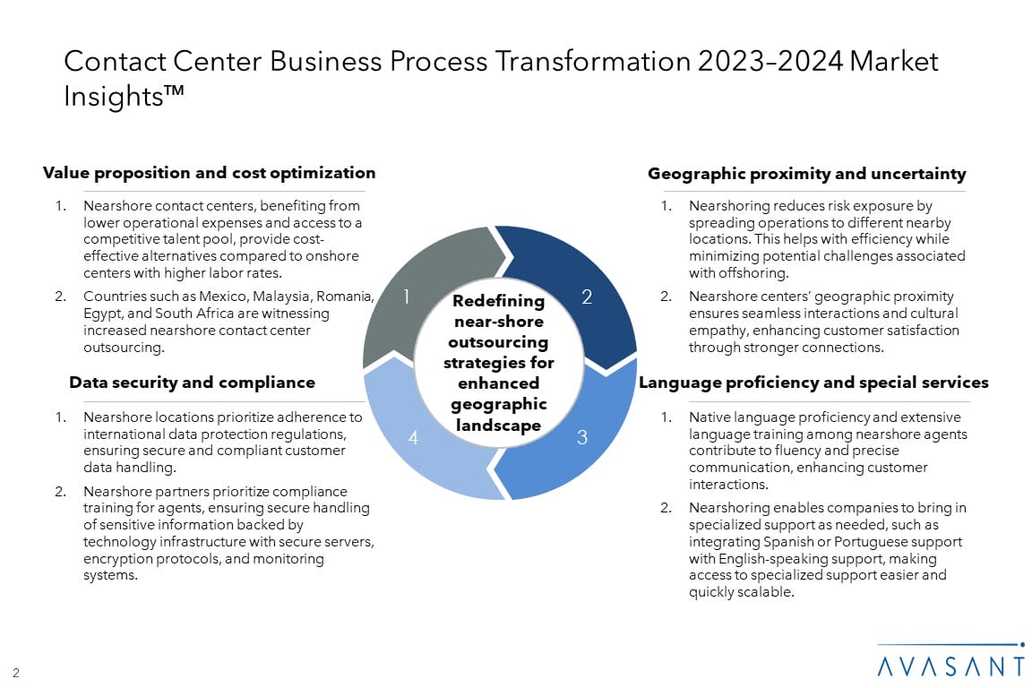 Contact center outsourcing has seen a dynamic shift in the past 12 months, primarily driven by evolving customer demands, technological advancements, and geographical uncertainties. This led to adaptation technologies such as generative AI, chatbots, and analytics to personalize interactions and improve agent efficiency. Hybrid delivery models combining onshore, nearshore, and offshore locations are becoming common to leverage cost advantages and specialized skills. The integration of technologies, brand consistency across channels, and interaction quality concerns are pushing enterprises to invest in areas like agent training and upskilling as the requirement increases for agents to handle more complex cases.