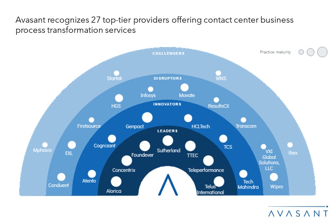 Please refer to Avasant’s Contact Center Business Process Transformation 2023–2024 RadarView™ for detailed insights on service providers and supply-side trends.