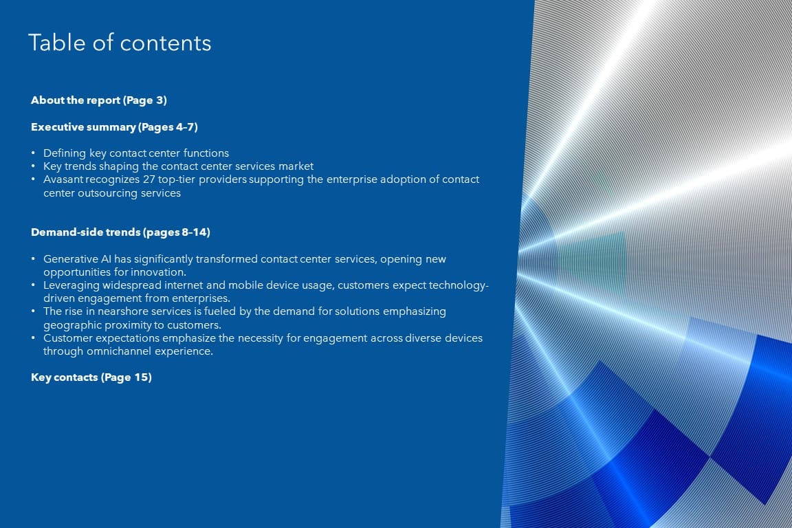 This report identifies key demand-side trends in the contact center business process transformation space that can help enterprises revamp their contact center operations. It also describes enterprise challenges in the contact center business process transformation space based on Avasant’s assessment.