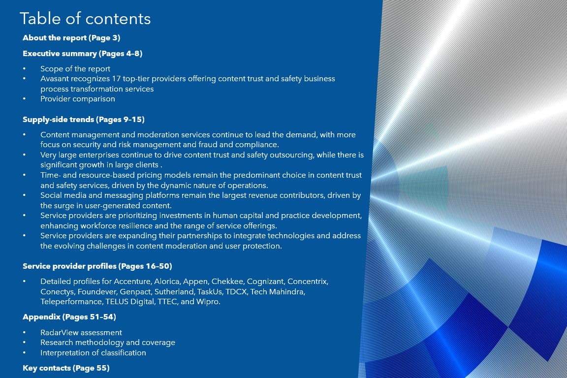 This RadarView includes a detailed analysis of the following trust and safety service providers: Accenture, Alorica, Appen, Chekkee, Cognizant, Concentrix, Conectys, Foundever, Genpact, Sutherland, TaskUs, TDCX, Tech Mahindra, Teleperformance, TELUS Digital, TTEC, and Wipro.