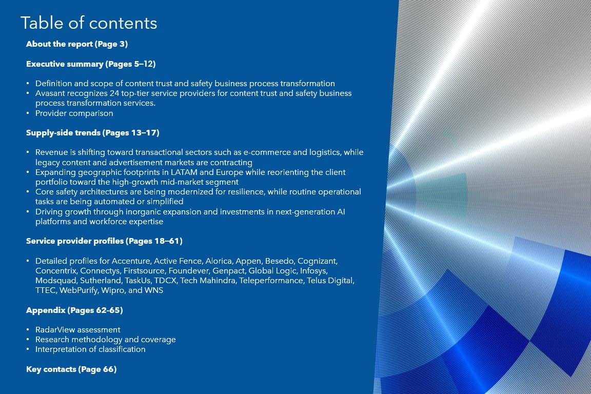 The Content Trust and Safety Business Process Transformation 2025–2026 RadarView™ highlights key supply-side trends in this space and Avasant’s viewpoint on them. It aids companies in identifying top service providers to assist them in content trust and safety business process transformation. It also analyzes each service provider’s capabilities in technology and delivery support, enabling organizations to select the right strategic partners for their content trust and safety processes.