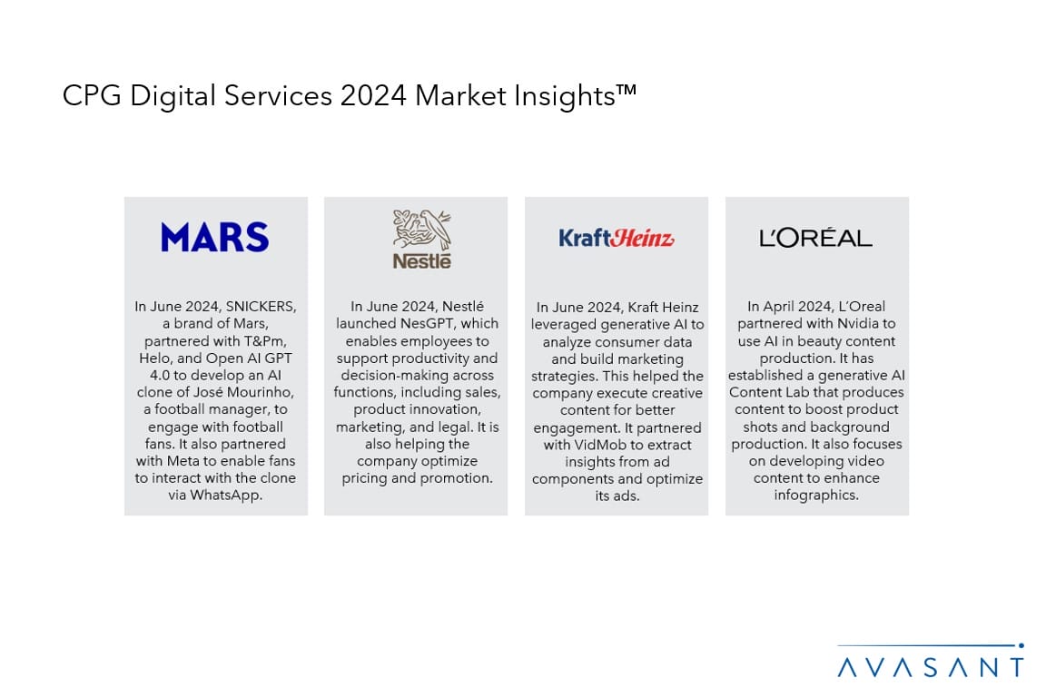 Consumer packaged goods (CPG) companies are increasingly investing in AI-driven marketing technologies to enhance campaign effectiveness, establish brand differentiation, and improve ROI. They are also leveraging IoT solutions to optimize supply chain efficiency and ensure product availability while utilizing blockchain technology to guarantee product authenticity. Moreover, the use of generative AI is helping CPG companies identify new market opportunities and aid in product development. In manufacturing, companies are adopting smart practices like 3D printing, collaborative robots, and AI to reduce operational waste and minimize inventory needs. Additionally, they are rethinking product packaging to meet their ESG goals while maintaining sustainable supply chains for raw material procurement.