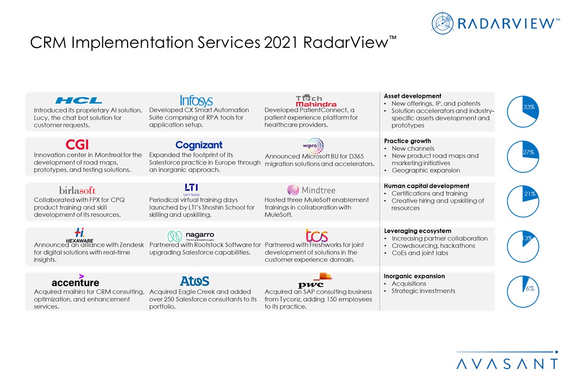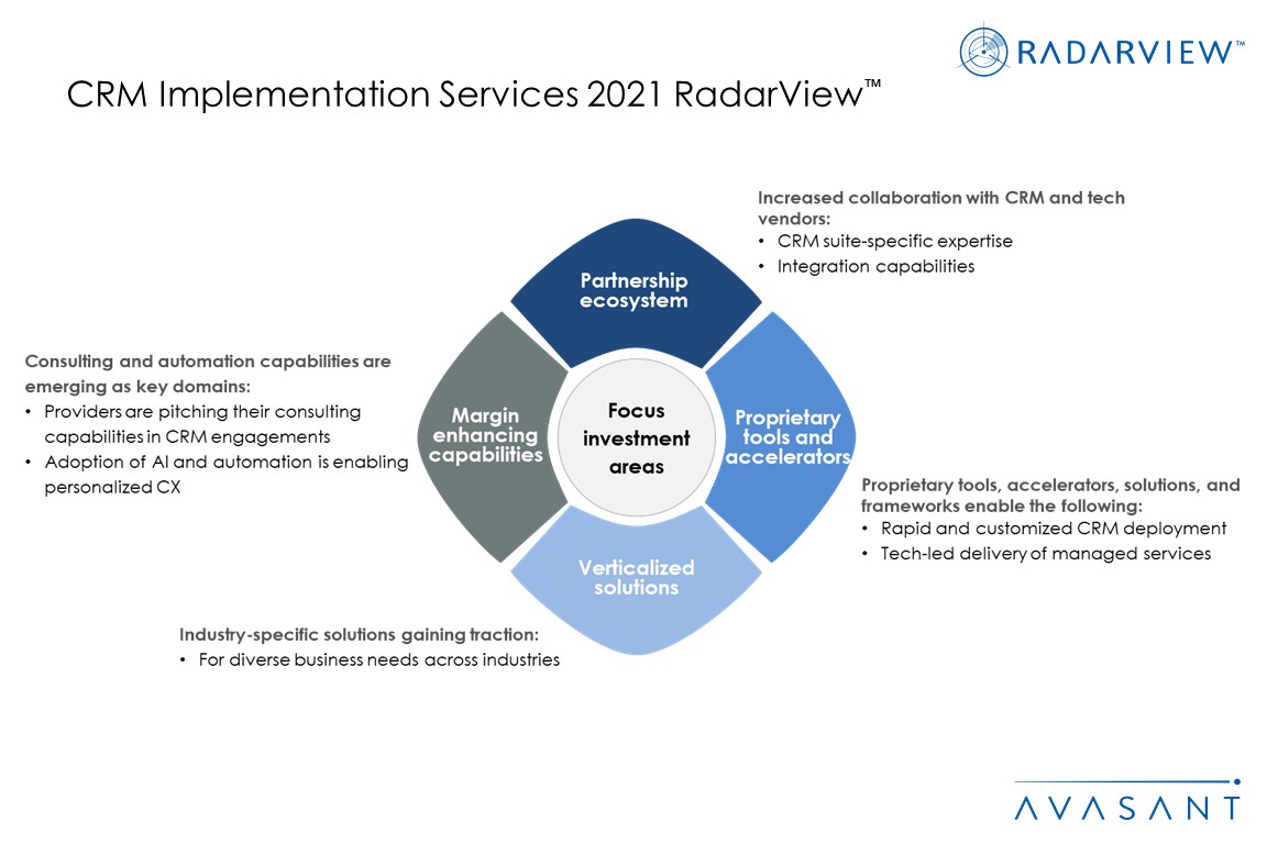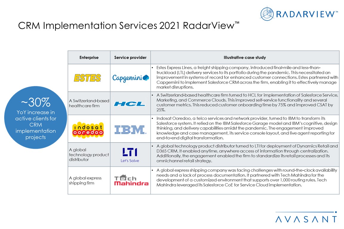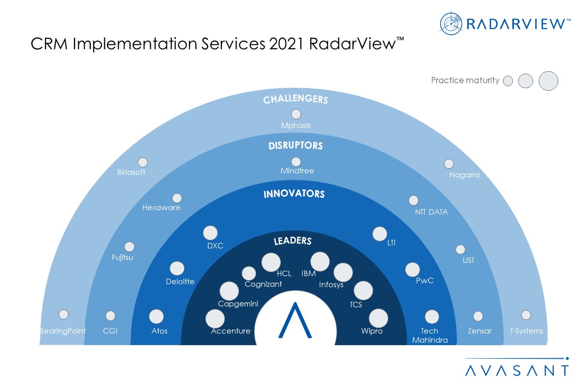 The CRM Implementation Services 2021 RadarView highlights the key market trends in the CRM space and Avasant’s viewpoint. It aids companies in identifying top service providers to assist them in implementation and maintenance of CRM platforms. It also offers an analysis of each service provider’s capabilities in technology and delivery support, thus enabling organizations to identify the right strategic partners for their CRM transformation.