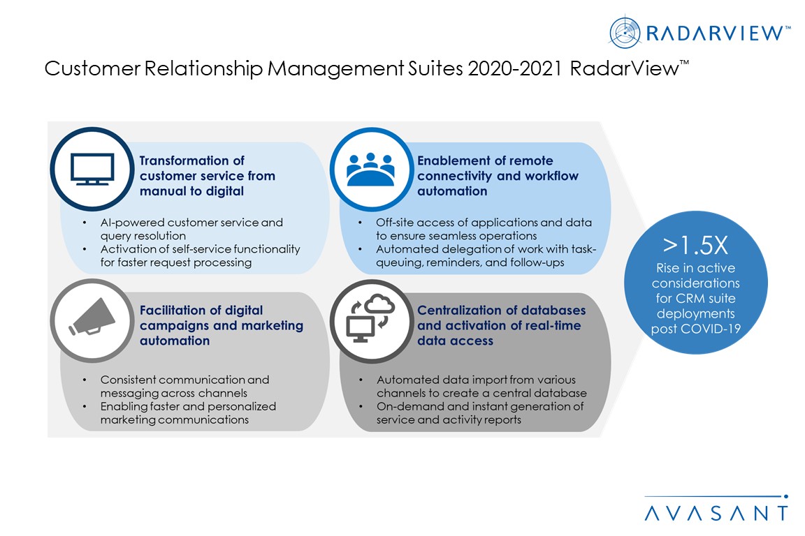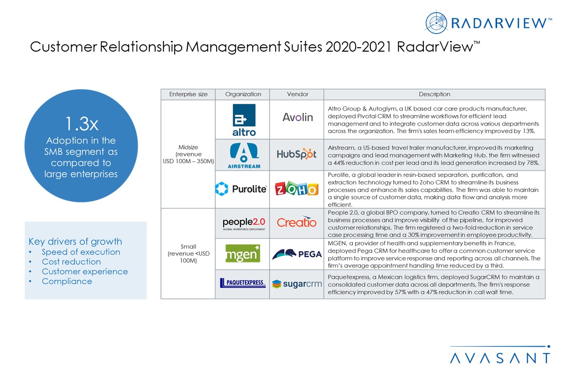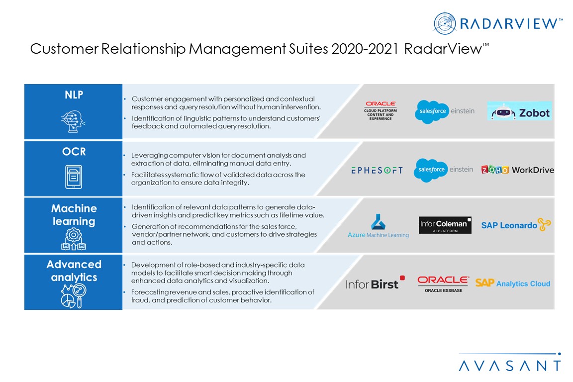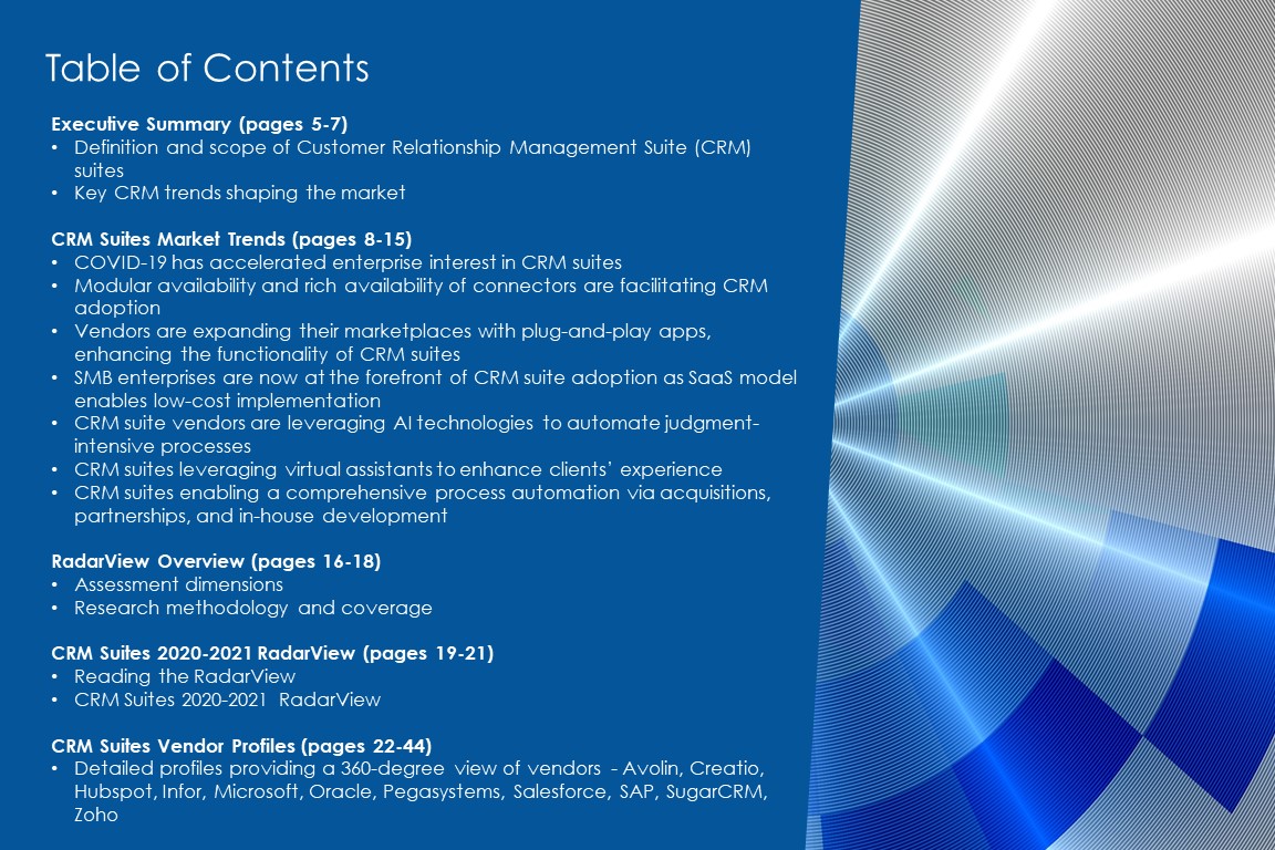 This RadarView includes a detailed analysis of CRM suites from Avolin, Creatio, Hubspot, Infor, Microsoft, Oracle, Pegasystems, Salesforce, SAP, SugarCRM, Zoho.