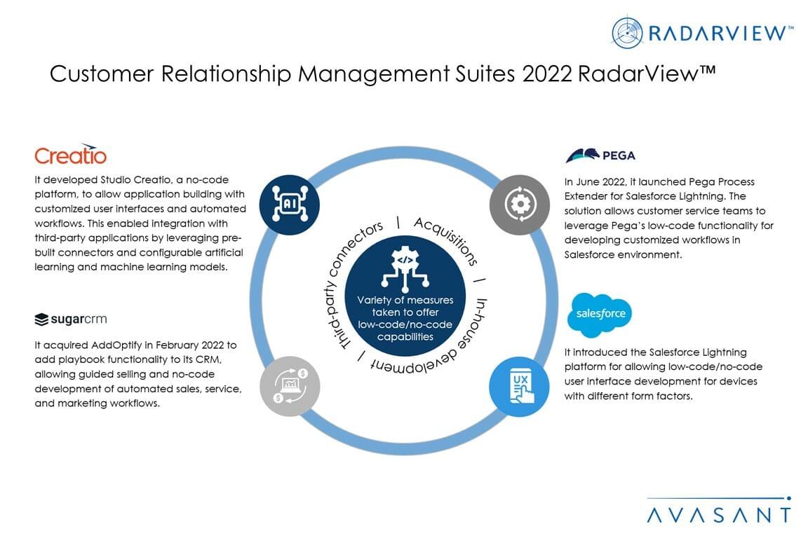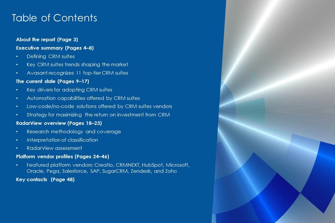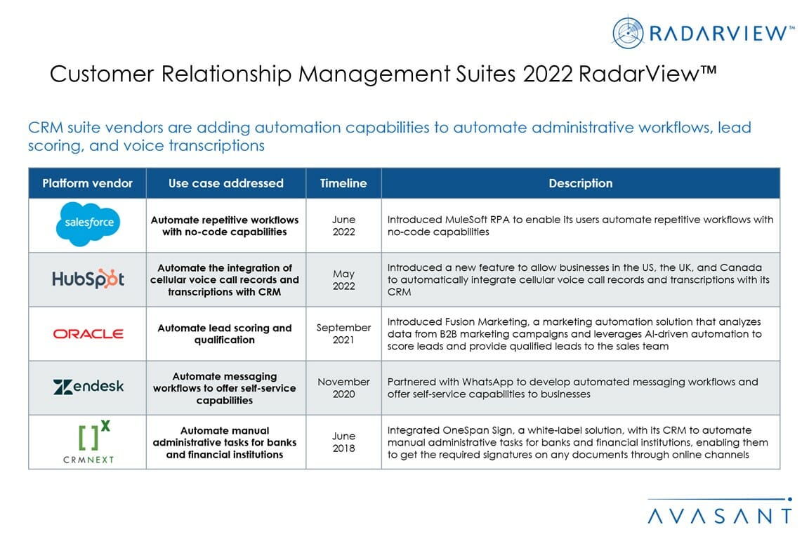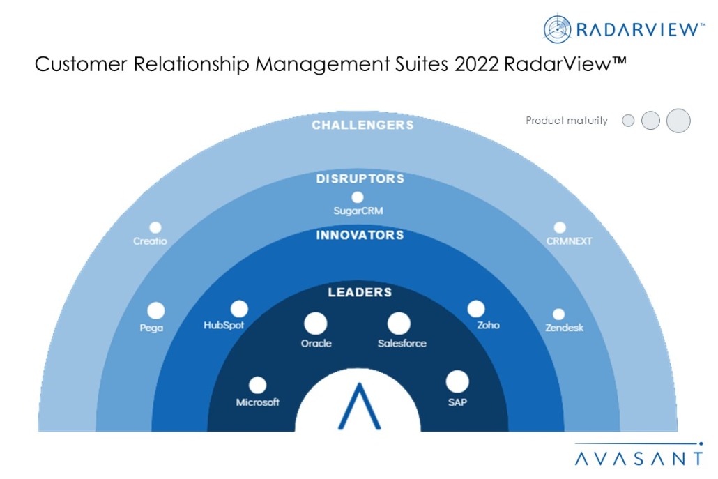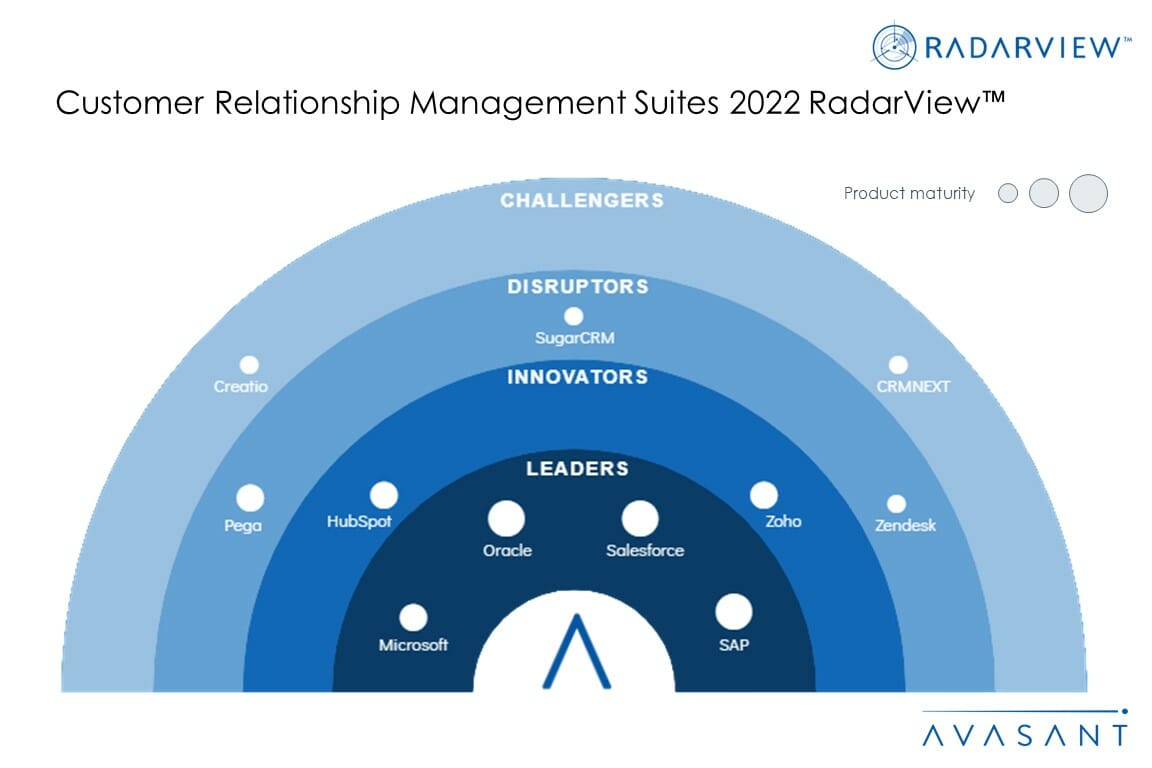 This RadarView includes a detailed analysis of the following CRM suite vendors: Creatio, CRMNEXT, HubSpot, Microsoft, Oracle, Pega, Salesforce, SAP, SugarCRM, Zendesk, and Zoho.