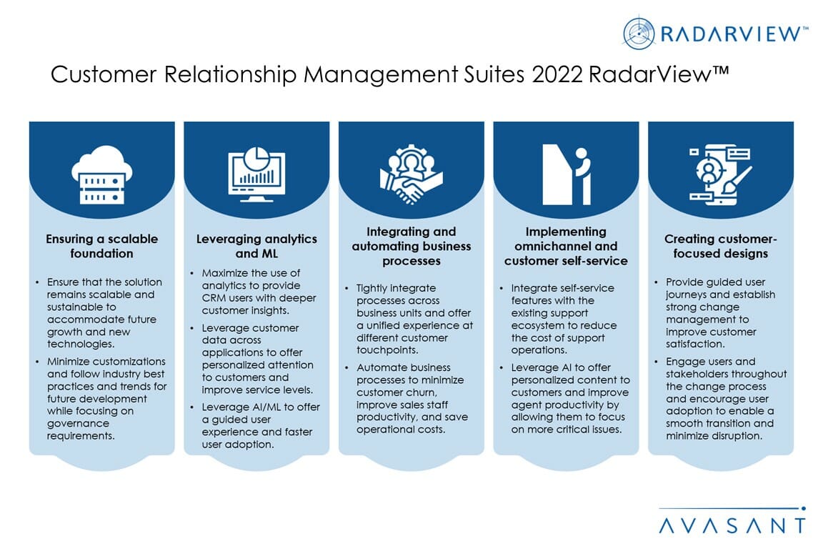 Our evaluation of CRM suites is based on primary input from the vendors, focused briefings, public disclosures, and Avasant’s ongoing market interactions. The assessment is across the three dimensions of product maturity, enterprise adaptability, and innovation road map, leading to our recognition of those CRM suites vendors that have brought the most value to the market over the past 12 months.