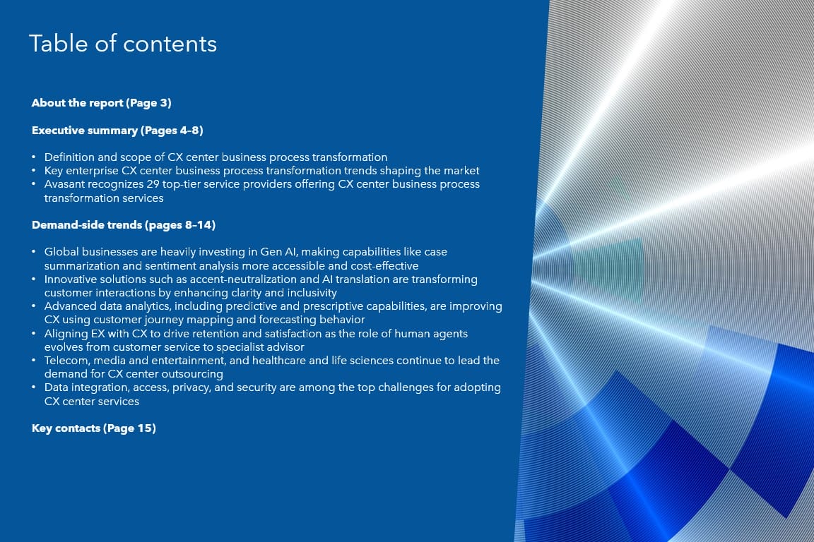 This report identifies key demand-side trends in the customer experience (CX) center business process transformation space that can help enterprises revamp their CX operations. It also describes enterprise challenges in the CX business process transformation space based on Avasant’s assessment.