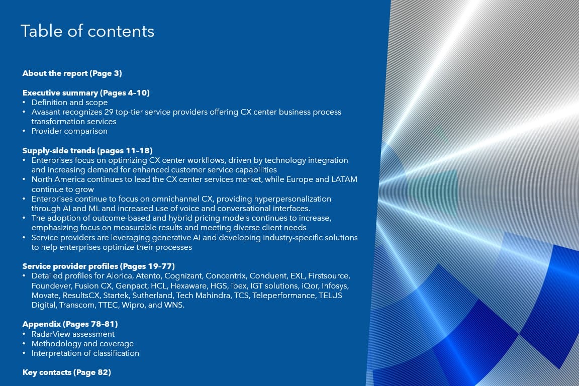 This RadarView analyzes the following service providers in the CX center business process transformation space: Alorica, Atento, Cognizant, Concentrix, Conduent, EXL, Firstsource, Foundever, Fusion CX, Genpact, HCL, Hexaware, HGS, ibex, IGT solutions, iQor, Infosys, Movate, ResultsCX, Startek, Sutherland, Tech Mahindra, TCS, Teleperformance, TELUS Digital, Transcom, TTEC, Wipro, and WNS.