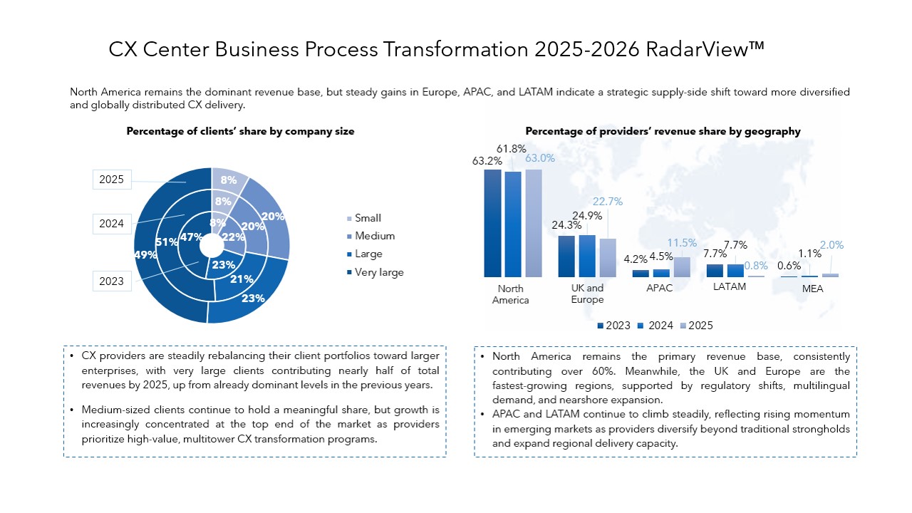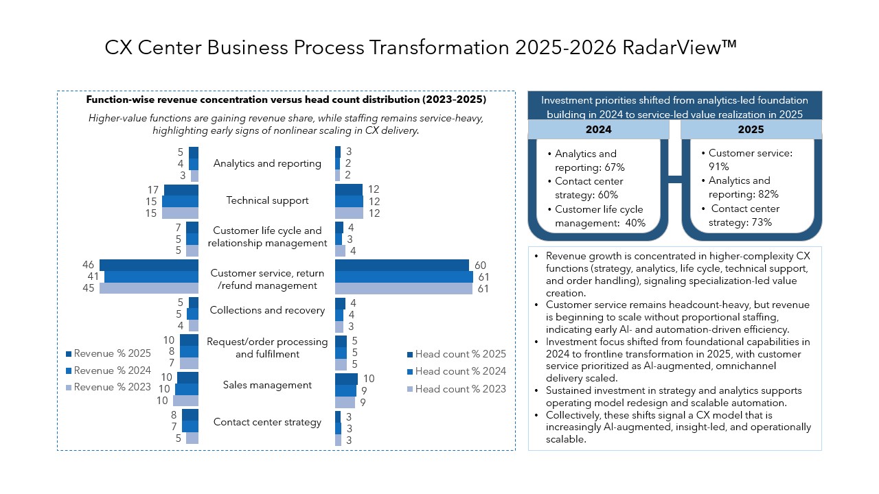 The CX Center Business Process Transformation 2025–2026 RadarView™ aids companies in identifying top service providers to reinvent their customer service. It also analyzes each service provider’s technology and delivery capabilities, thus enabling organizations to identify the right strategic partners for their CX center transformation.