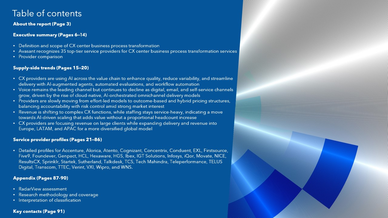 This RadarView analyzes the following service providers in the CX center business process transformation space: Accenture, Alorica, Atento, Cognizant, Concentrix, Conduent, EXL, Firstsource, Five9, Foundever, Genpact, HCL, Hexaware, HGS, Ibex, IGT Solutions, Infosys, iQor, Movate, NICE, ResultsCX, Sprinklr, Startek, Sutherland, Talkdesk, TCS, Tech Mahindra, Teleperformance, TELUS Digital, Transcom, TTEC, Verint, VXI, Wipro, and WNS.