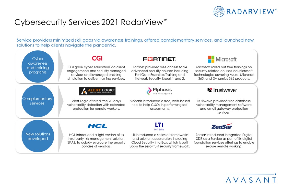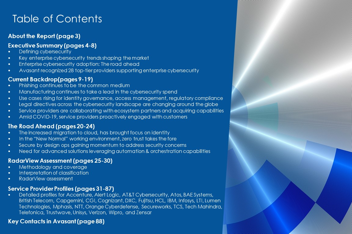 This RadarView includes an analysis of the following digital service providers in the cybersecurity space: Accenture, Alert Logic, AT&T Cybersecurity, Atos, BAE Systems, British Telecom, Capgemini, CGI, Cognizant, DXC, Fujitsu, HCL, IBM, Infosys, LTI, Lumen Technologies, Mphasis, NTT, Orange Cyberdefense, Secureworks, TCS, Tech Mahindra, Telefonica, Trustwave, Unisys, Verizon, Wipro, and Zensar.