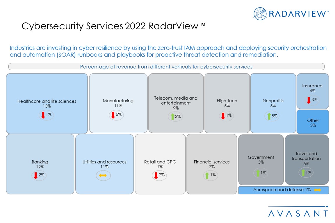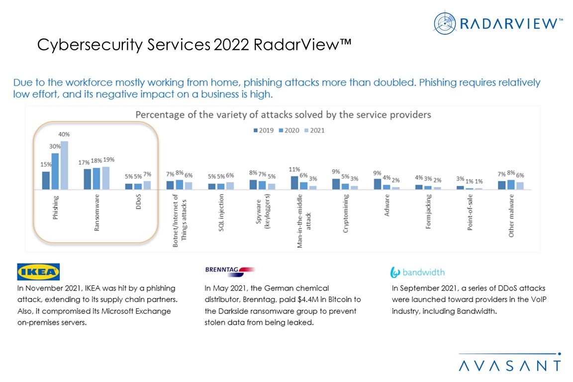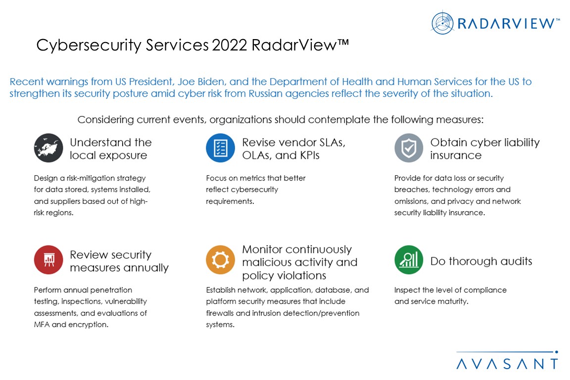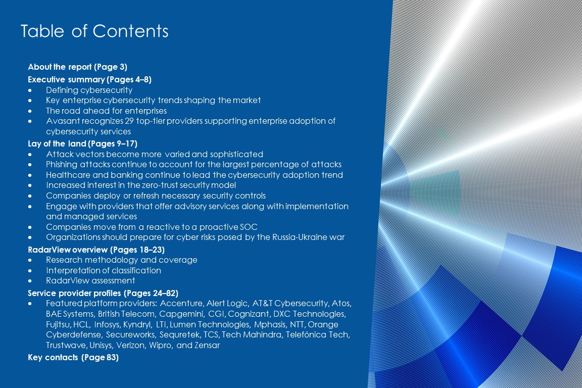 The Cybersecurity Services 2022 RadarView™ highlights key cybersecurity market trends and Avasant’s viewpoint. It aids companies in identifying top service providers to assist them in adopting cybersecurity solutions. It also offers an analysis of each service provider’s capabilities in technology and delivery support, enabling organizations to identify the right strategic partners for cybersecurity.