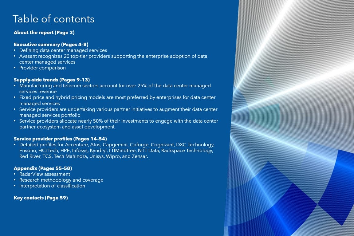 This RadarView includes a detailed analysis of the following data center managed service providers: Accenture, Atos, Capgemini, Coforge, Cognizant, DXC Technology, Ensono, HCLTech, HPE, Infosys, Kyndryl, LTIMindtree, NTT Data, Rackspace Technology, Red River, TCS, Tech Mahindra, Unisys, Wipro, and Zensar.