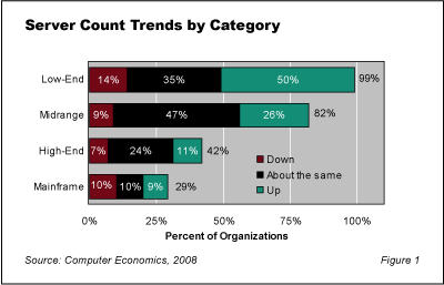 Proliferation of low-end servers is a common problem in data centers today. Proliferation results in low overall utilization of server hardware, higher-than-needed support costs and excess energy consumption. In response, as we have reported in earlier studies, organizations are fighting server proliferation by investing in server virtualization, data center consolidation, and data center automation tools. In theory, these investments should result in slower growth of low-end servers and increasing growth in the acquisition of more powerful servers. In practice, however, organizations appear to be restraining the growth of all classes of servers and reducing overall spending on server hardware and software.