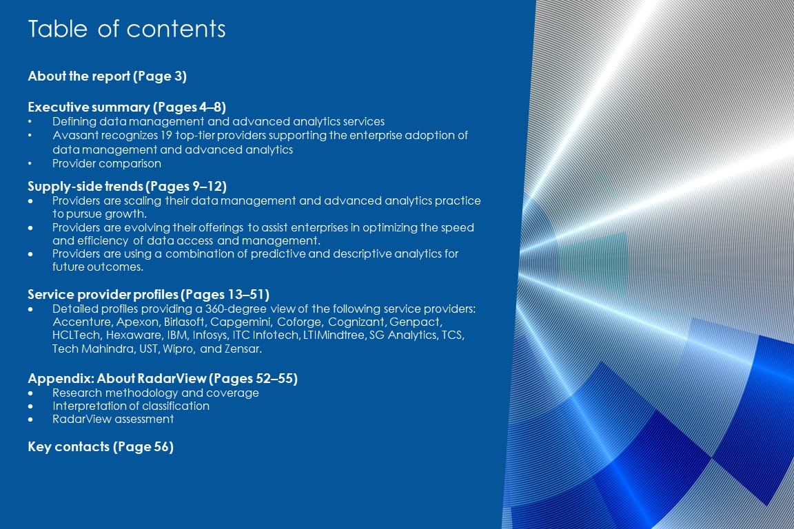 This RadarView includes a detailed analysis of the following data management and advanced analytics service providers: Accenture, Apexon, Birlasoft, Capgemini, Coforge, Cognizant, Genpact, HCLTech, Hexaware, IBM, Infosys, ITC Infotech, LTIMindtree, SG Analytics, TCS, Tech Mahindra, UST, Wipro, and Zensar.