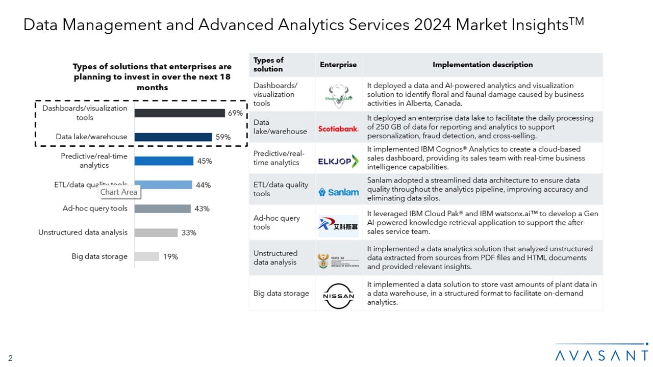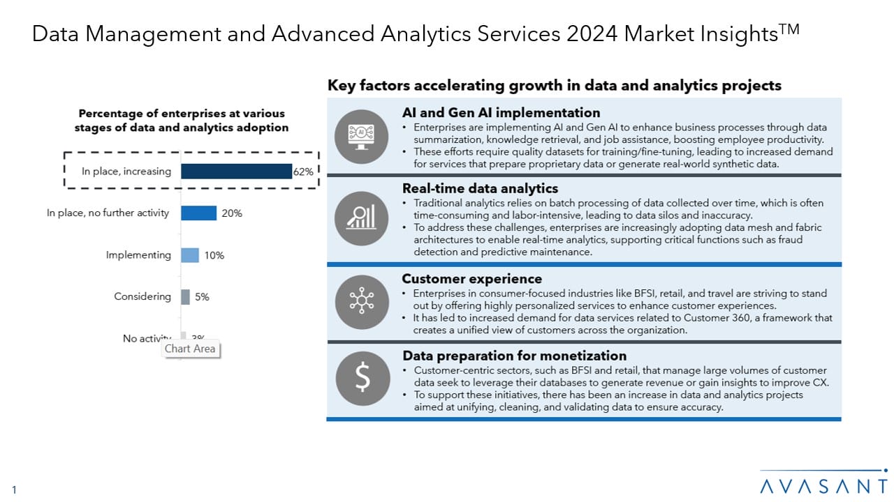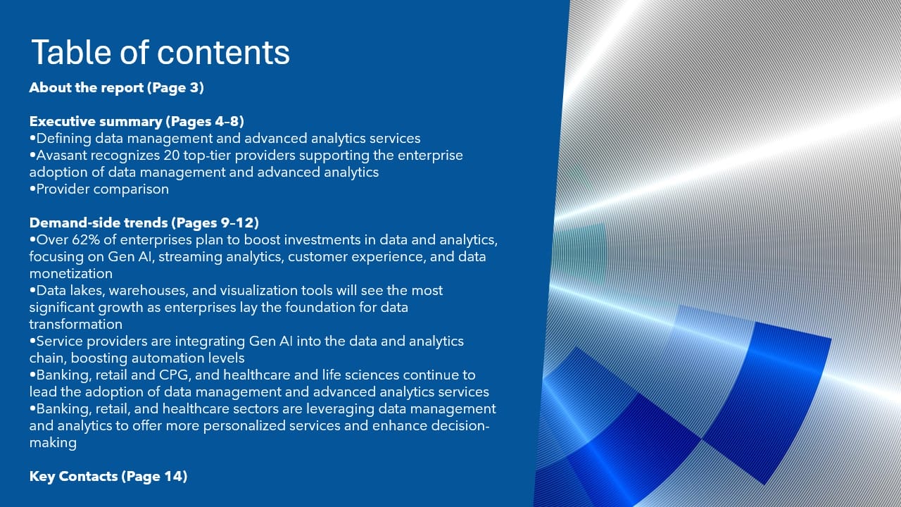 This report identifies key demand-side trends in the data management and advanced analytics services space to assist enterprises in their data management and advanced analytics journeys. It provides an overview of key trends and enterprise challenges that Avasant considers important to highlight in the data management and advanced analytics services space.