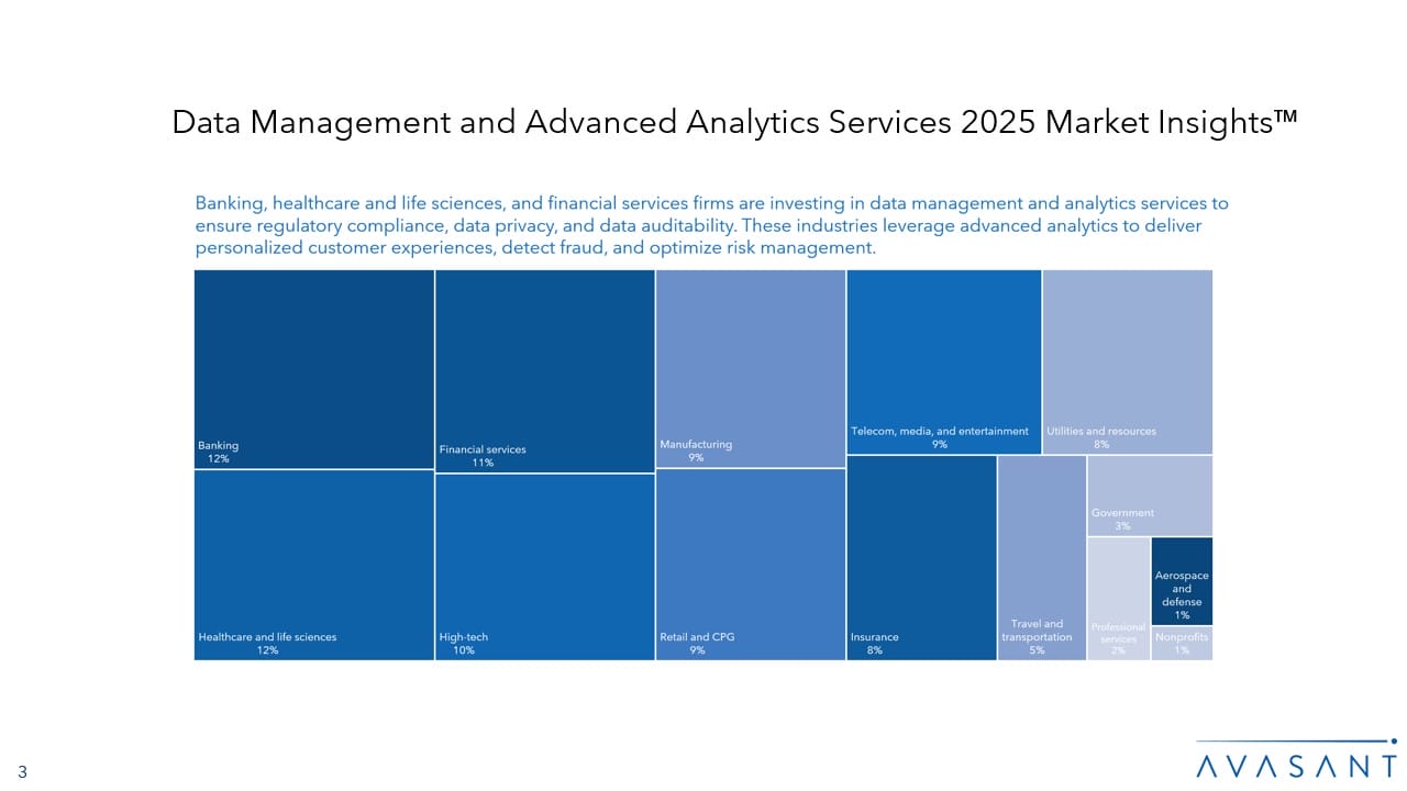 This report identifies key demand-side trends in the data management and advanced analytics services space to assist enterprises in their data management and advanced analytics journeys. It provides an overview of key trends and enterprise challenges that Avasant considers important to highlight in the data management and advanced analytics services space.
