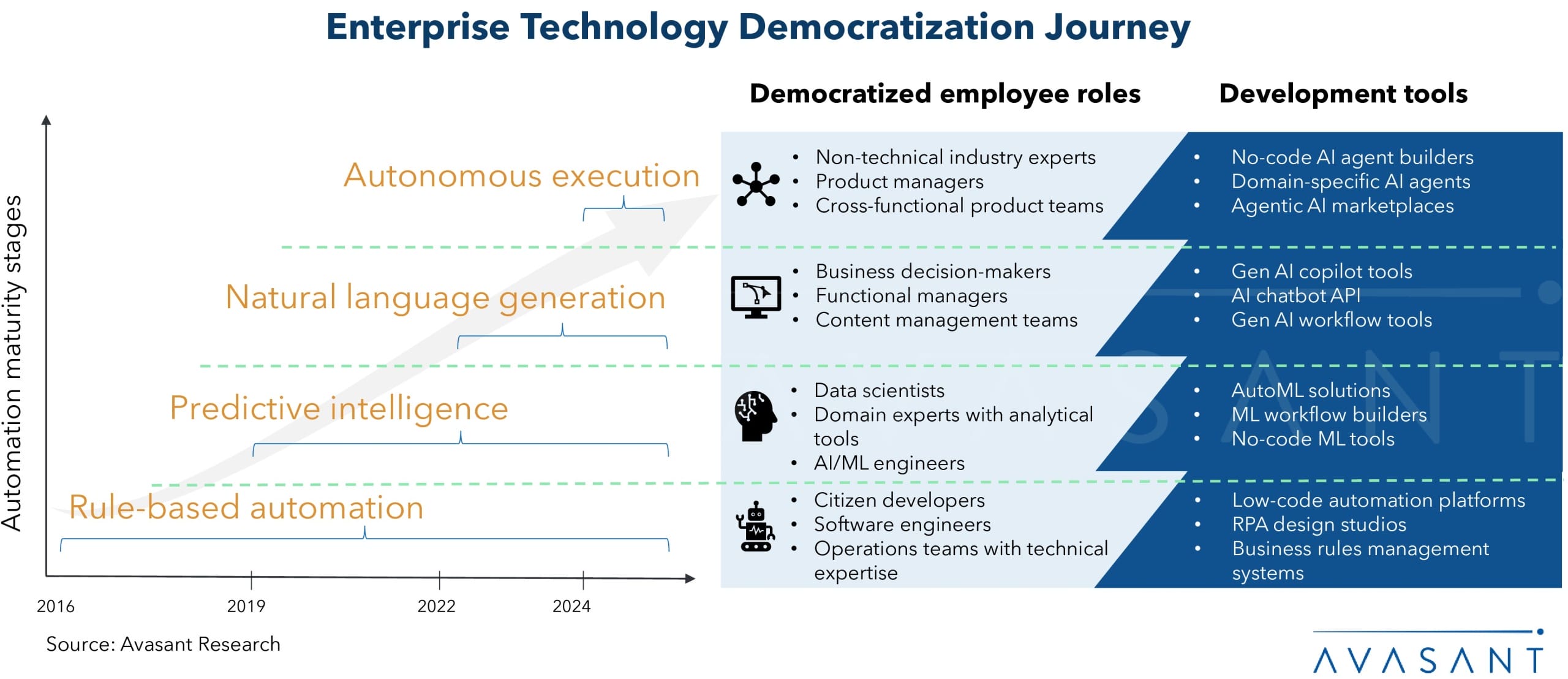 In the early days, RPA allowed frontline employees to adjust predefined logic for repetitive tasks. Then came the rise of traditional AI and AutoML platforms, where data scientists abstracted the complexity of modeling into templates that analysts and risk officers could experiment with, although deployment still required centralized oversight.