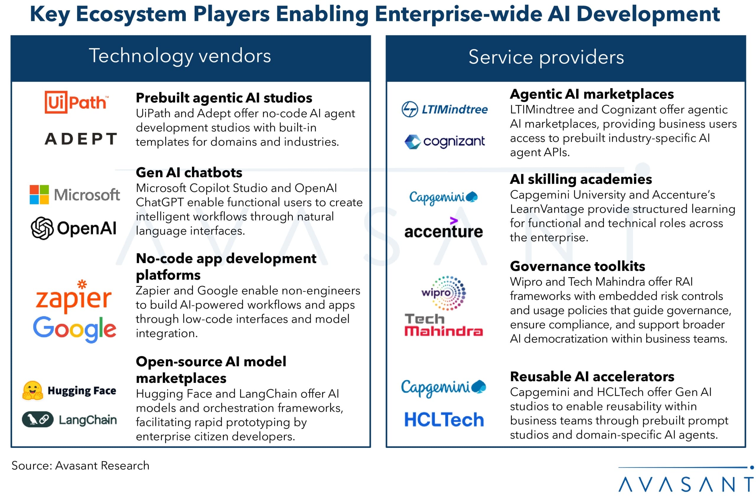 While the push toward democratizing AI is gaining momentum, it is driven by complementary efforts from both technology vendors and service providers. Vendors are simplifying access through no-code tools, open-source models, and generative interfaces, while service providers are enabling enterprise adoption through skilling academies, responsible AI governance, and prebuilt marketplaces of reusable, domain-specific AI agents.