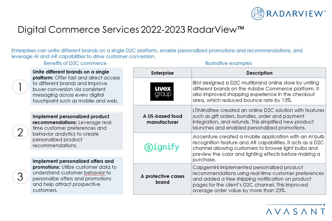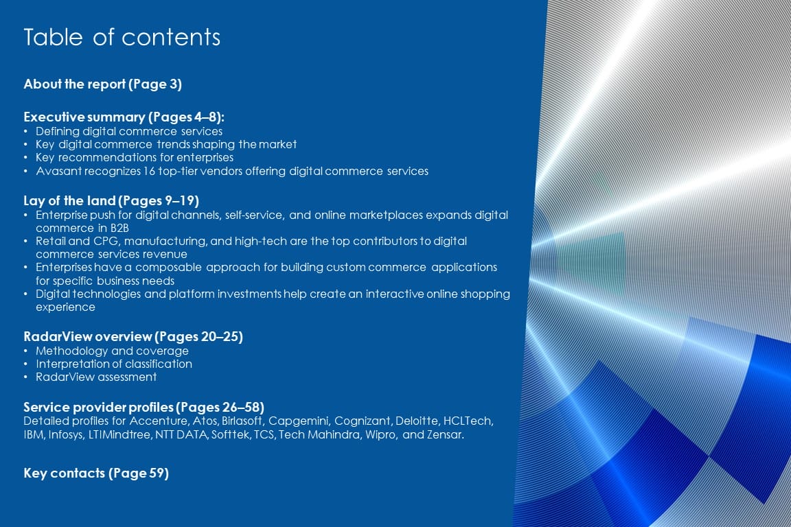 This RadarView includes an analysis of the following service providers in the digital commerce services space: Accenture, Atos, Birlasoft, Capgemini, Cognizant, Deloitte, HCLTech, IBM, Infosys, LTIMindtree, NTT DATA, Softtek, TCS, Tech Mahindra, Wipro, and Zensar.