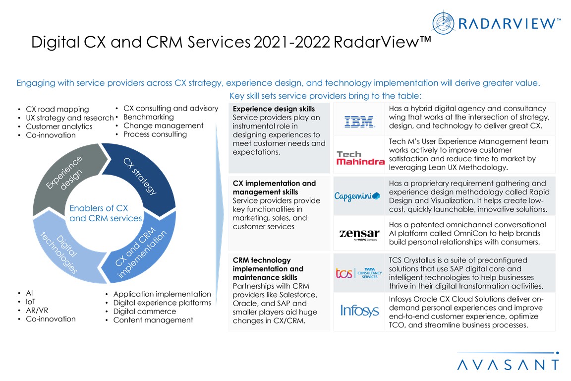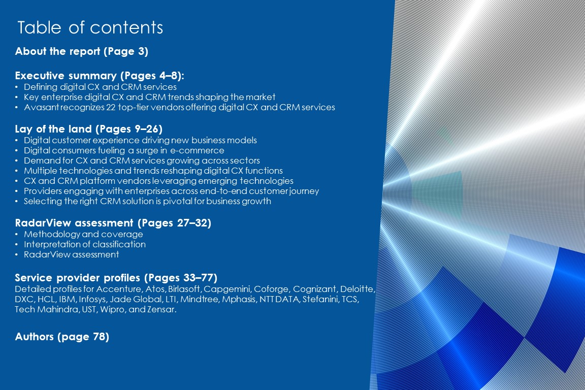 This RadarView includes an analysis of the following service providers in the digital CX and CRM services space: Accenture, Atos, Birlasoft, Capgemini, Coforge, Cognizant, Deloitte, DXC, HCL, IBM, Infosys, Jade Global, LTI, Mindtree, Mphasis, NTT DATA, Stefanini, TCS, Tech Mahindra, UST, Wipro, and Zensar.