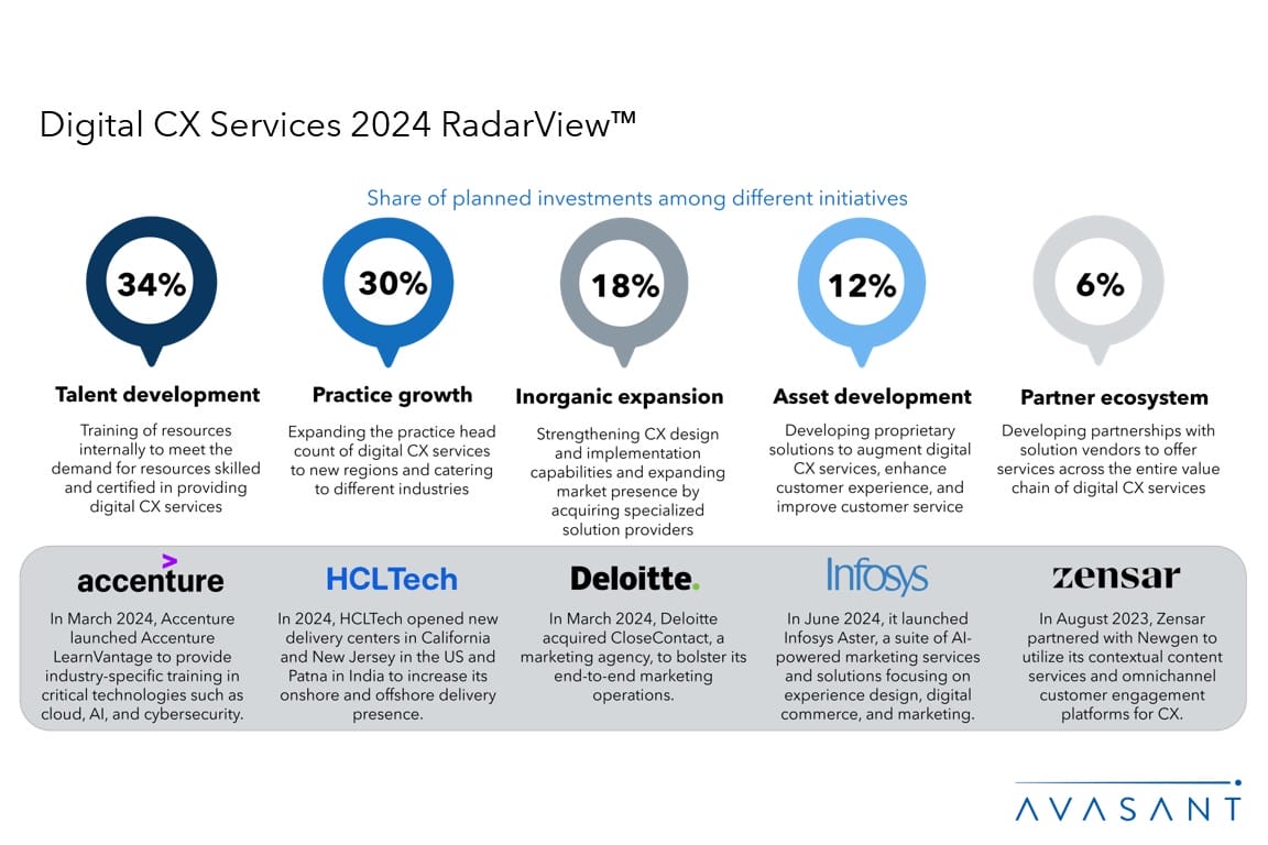• Service providers focus over 60% of their investments on talent development and practice growth to augment digital CX services.