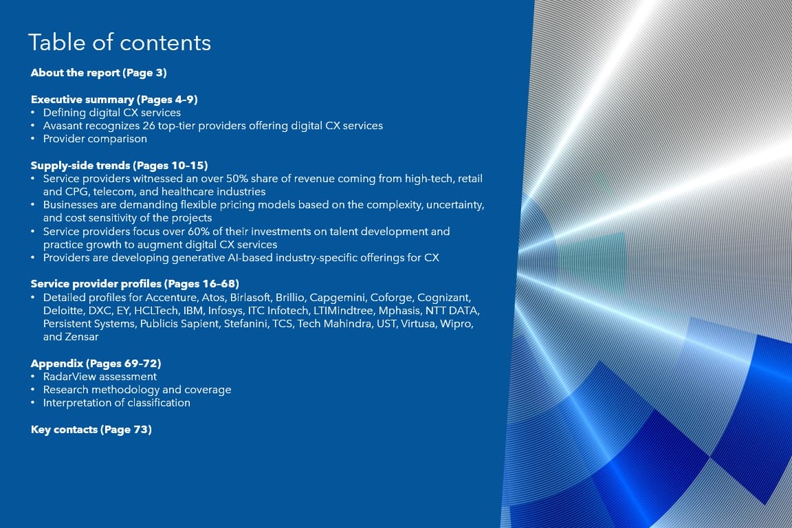 This RadarView includes a detailed analysis of the following digital CX services providers: Accenture, Atos, Birlasoft, Brillio, Capgemini, Coforge, Cognizant, Deloitte, DXC, EY, HCLTech, IBM, Infosys, ITC Infotech, LTIMindtree, Mphasis, NTT DATA, Persistent Systems, Publicis Sapient, Stefanini, TCS, Tech Mahindra, UST, Virtusa, Wipro, and Zensar.