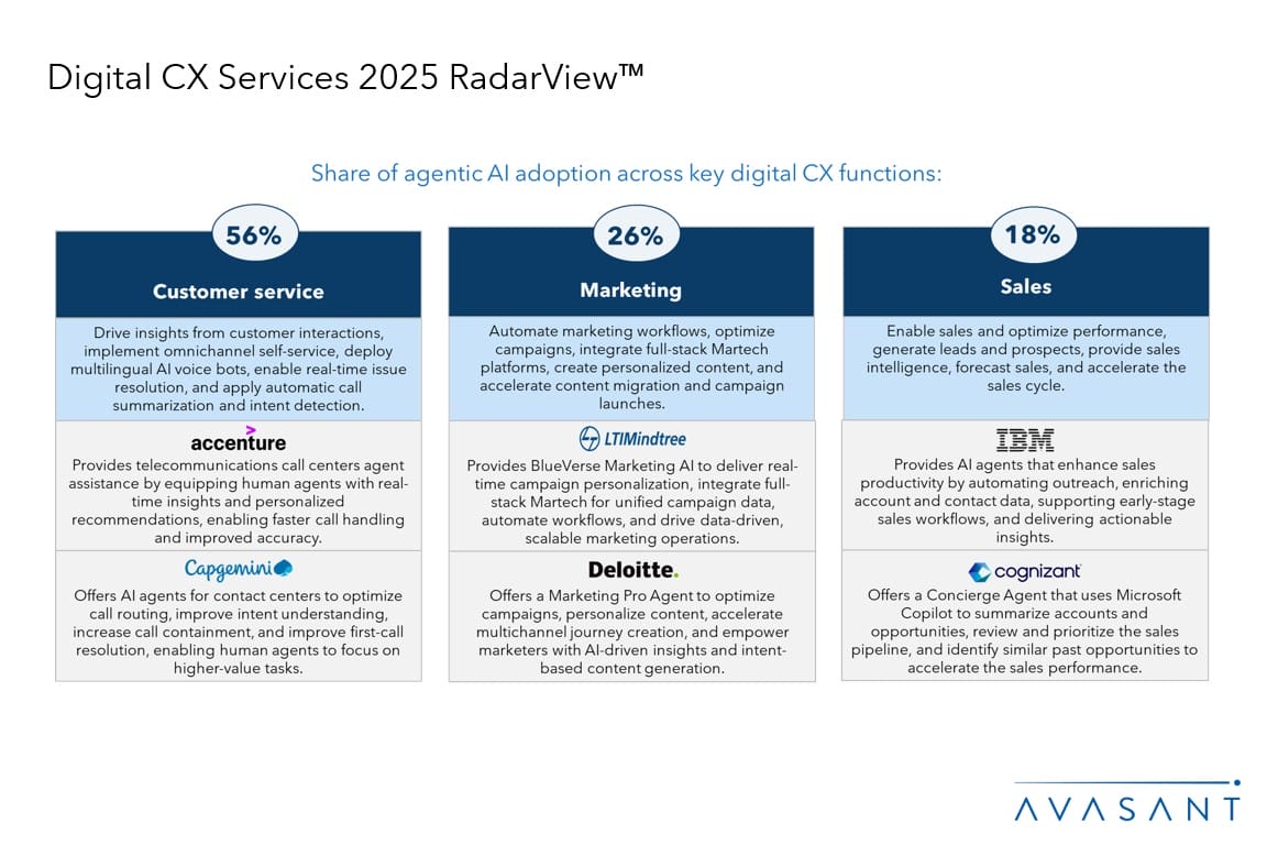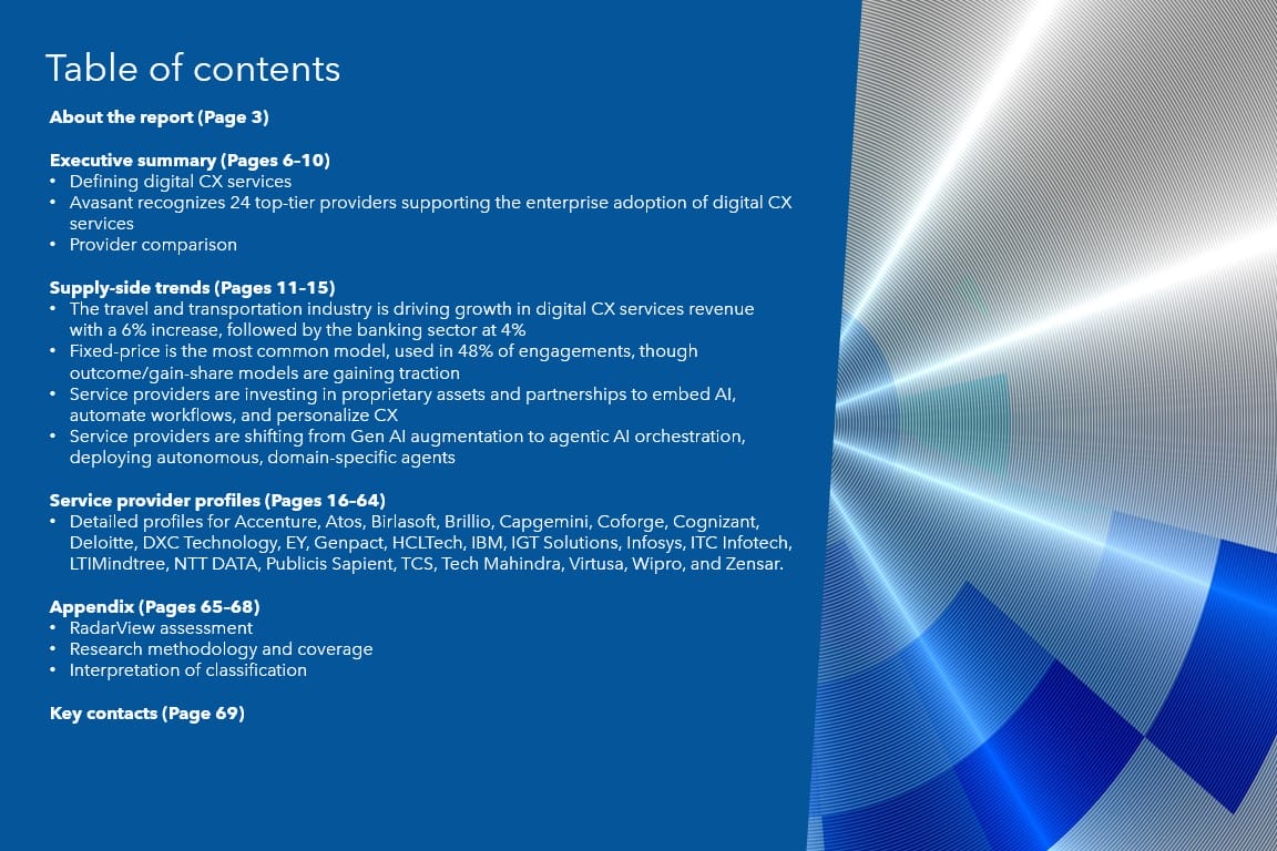 The Digital CX Services 2025 RadarView™ highlights key supply-side trends in the digital CX services space and Avasant’s viewpoint on them. It aids companies in identifying top service providers to assist them in adopting digital CX services. It also analyzes each service provider’s technology and delivery support capabilities, enabling organizations to identify the right strategic partners for managing their digital CX transformation.