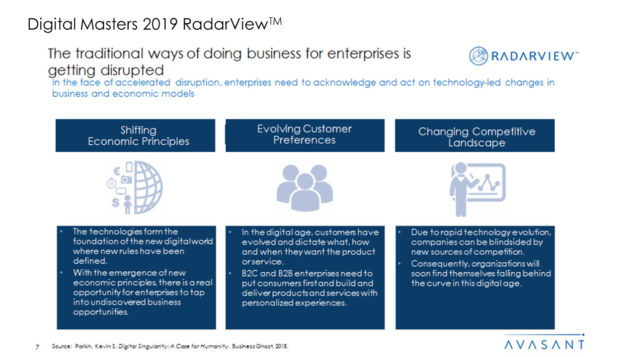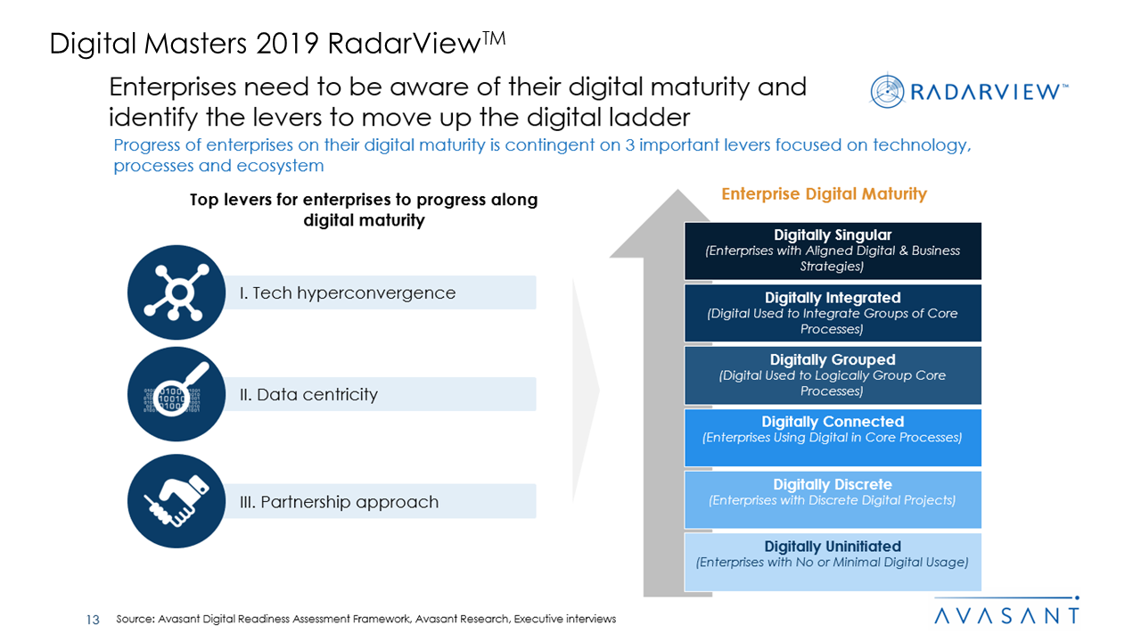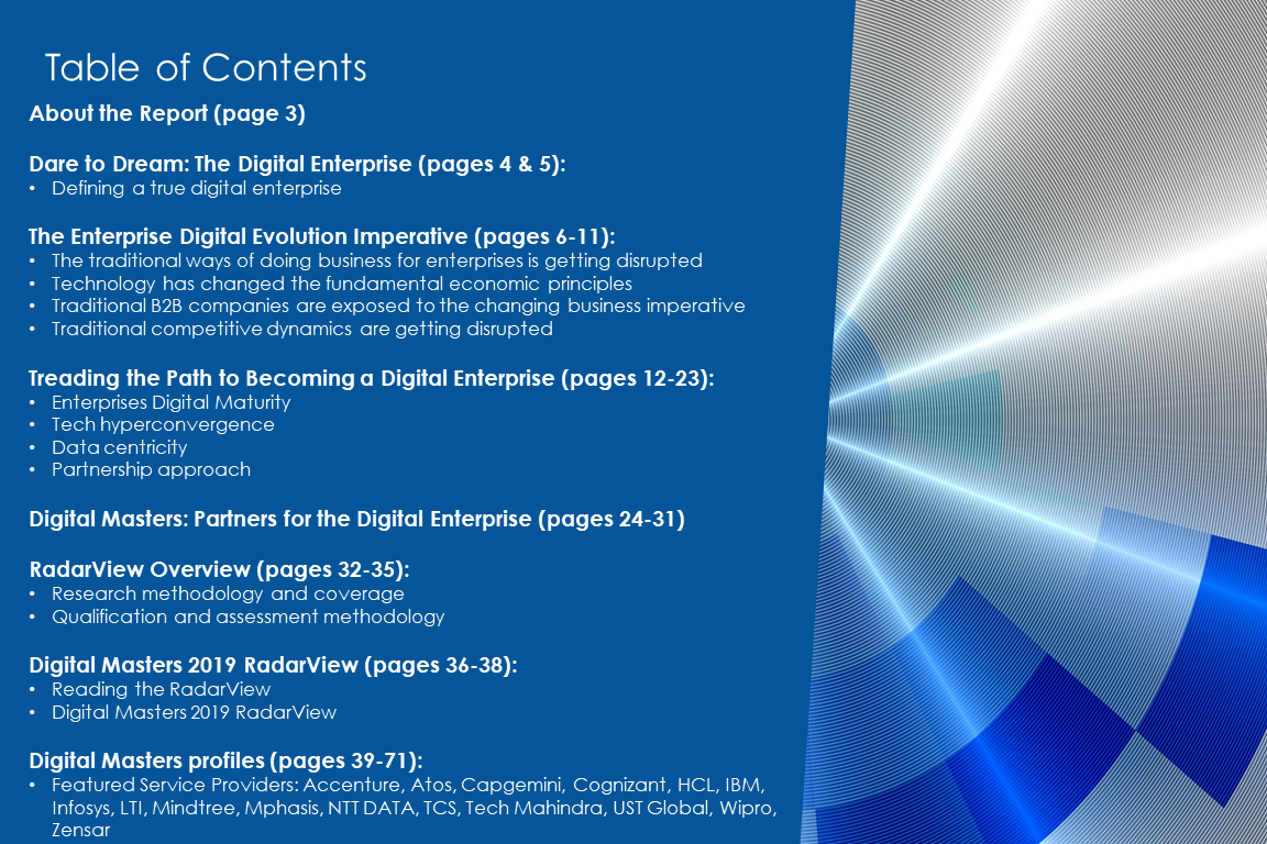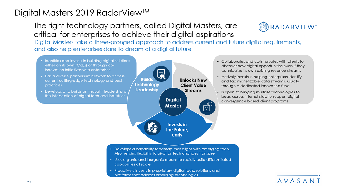 Global enterprises are facing unprecedented challenges posed by market disruption from digital native firms as well as unparalleled opportunities unleashed by the convergence of emerging technologies and innovative business models. Navigating through this vortex requires significant innovation and re-invention of the enterprise. Organizations need the support of an ecosystem of partners – technology vendors, service providers, and advisors to execute upon digital transformation successfully. Assessing and selecting the right partners to work with has become a complex exercise, and Digital Masters RadarView provides a holistic approach to address that need.