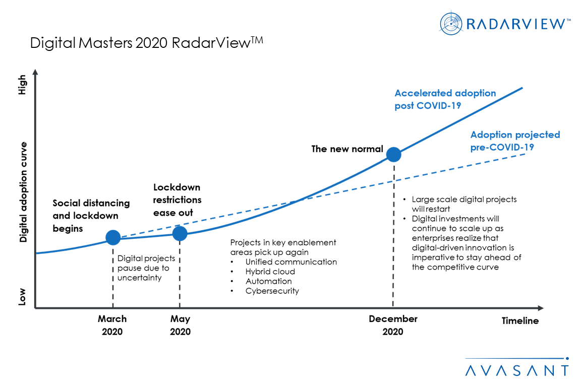 The need for digitization has been felt like never before as the COVID-19 pandemic restricts business activities in the physical world. Though digitally mature companies have been able turn the crisis to an opportunity, others risk disruption. Avasant’s ongoing interactions with enterprise digital leaders reveal that, in these unprecedented times, to minimize business disruption, protect employees, and better serve customers, they have accelerated their digital initiatives. Their strategic partnerships can help bring stability, reliability, and resilience to their businesses.
