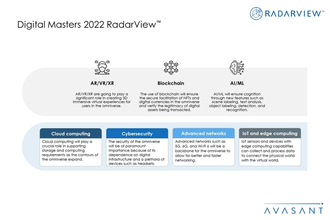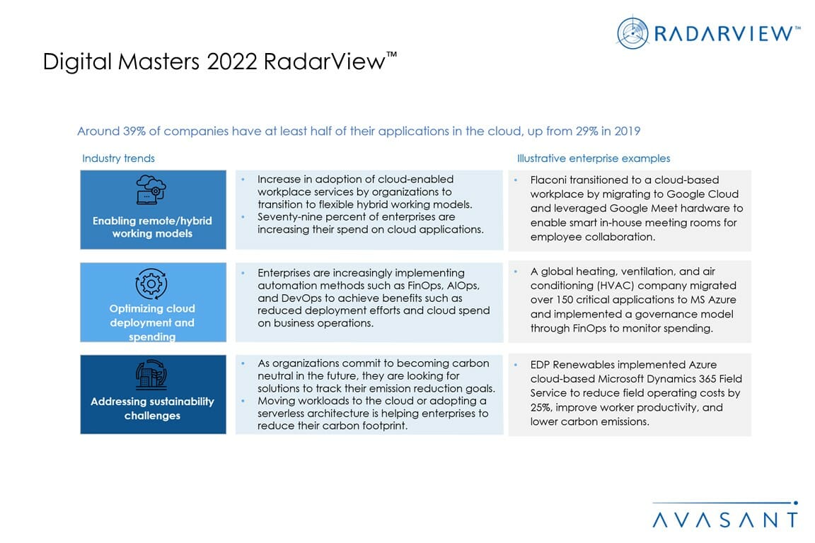 Avasant’s research and other publications are based on information from the best available sources and Avasant’s independent assessment and analysis at the time of publication. Avasant takes no responsibility and assumes no liability for any error/omission or the accuracy of information contained in its research publications. Avasant does not endorse any provider, product or service described in its RadarView™ publications or any other research publications that it makes available to its users, and does not advise users to select only those providers recognized in these publications. Avasant disclaims all warranties, expressed or implied, including any warranties of merchantability or fitness for a particular purpose. None of the graphics, descriptions, research, excerpts, samples or any other content provided in the report(s) or any of its research publications may be reprinted, reproduced, redistributed or used for any external commercial purpose without prior permission from Avasant, LLC. All rights are reserved by Avasant, LLC.